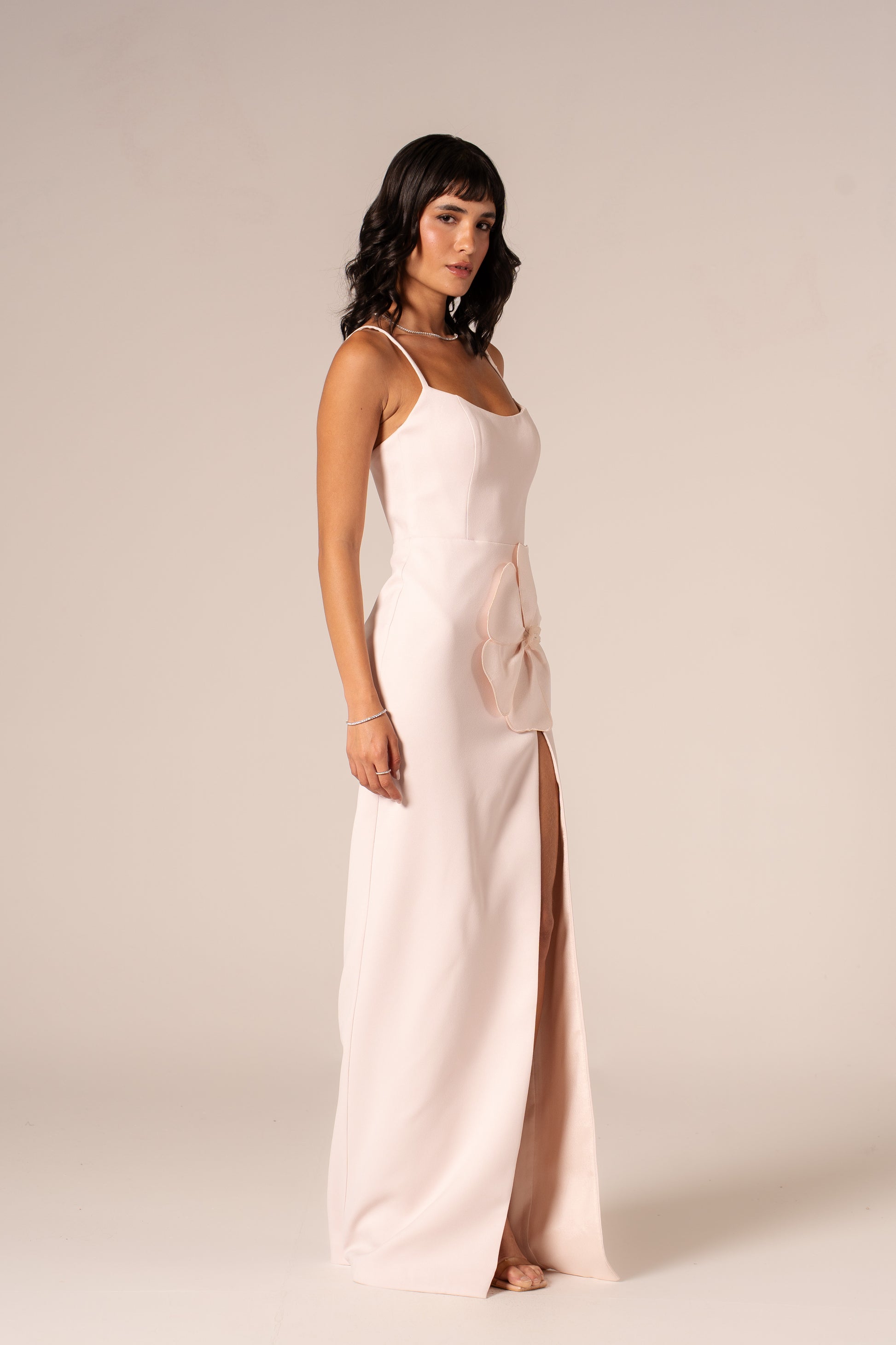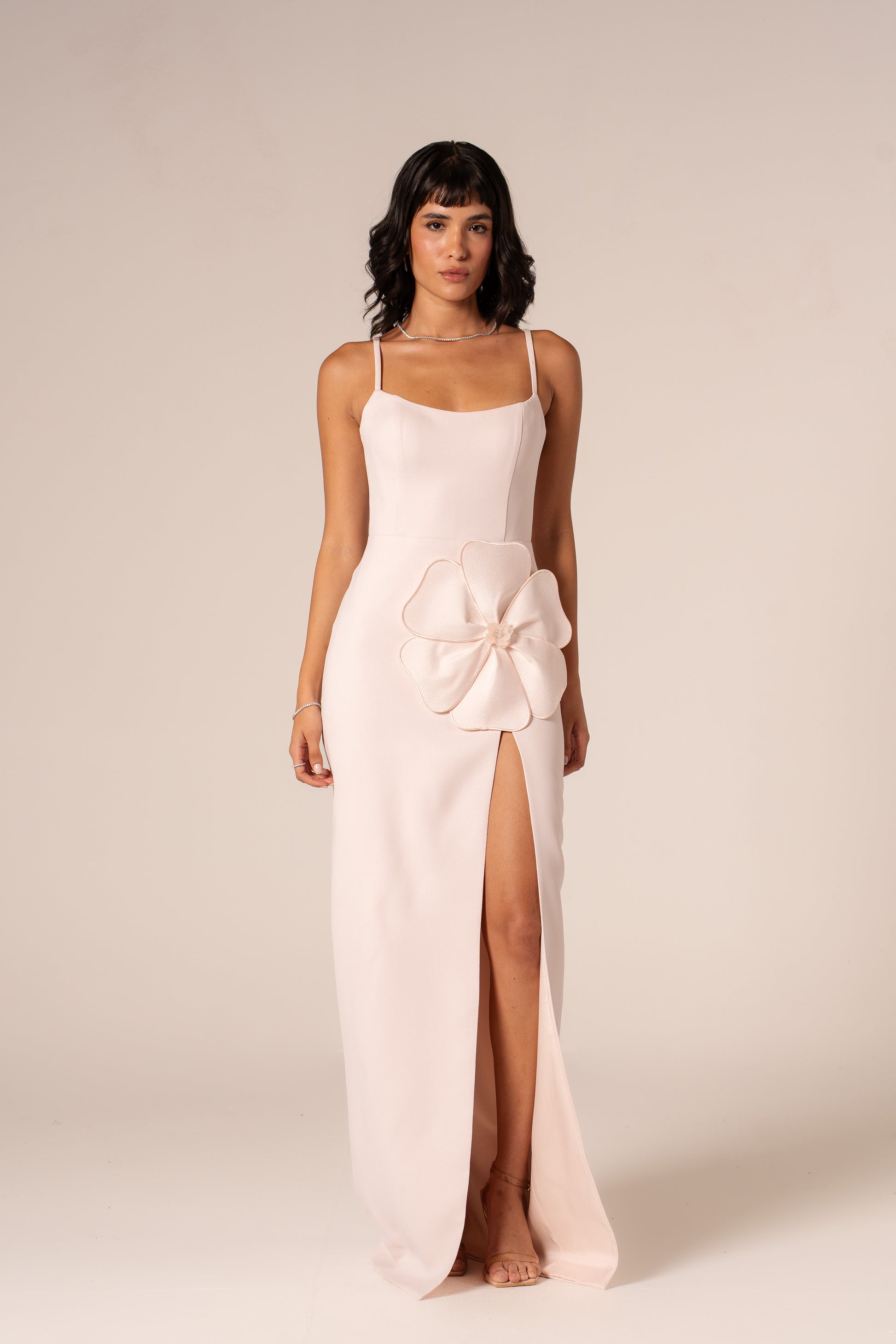 Introducing Priscilla, a soiree dress designed to enchant this wedding season. Featuring delicate straps with a square neckline, a daring high slit, and a floral detail at the waist, this crepe gown balances elegance with boldness. Ideal for those who seek a captivating, statement-making look.