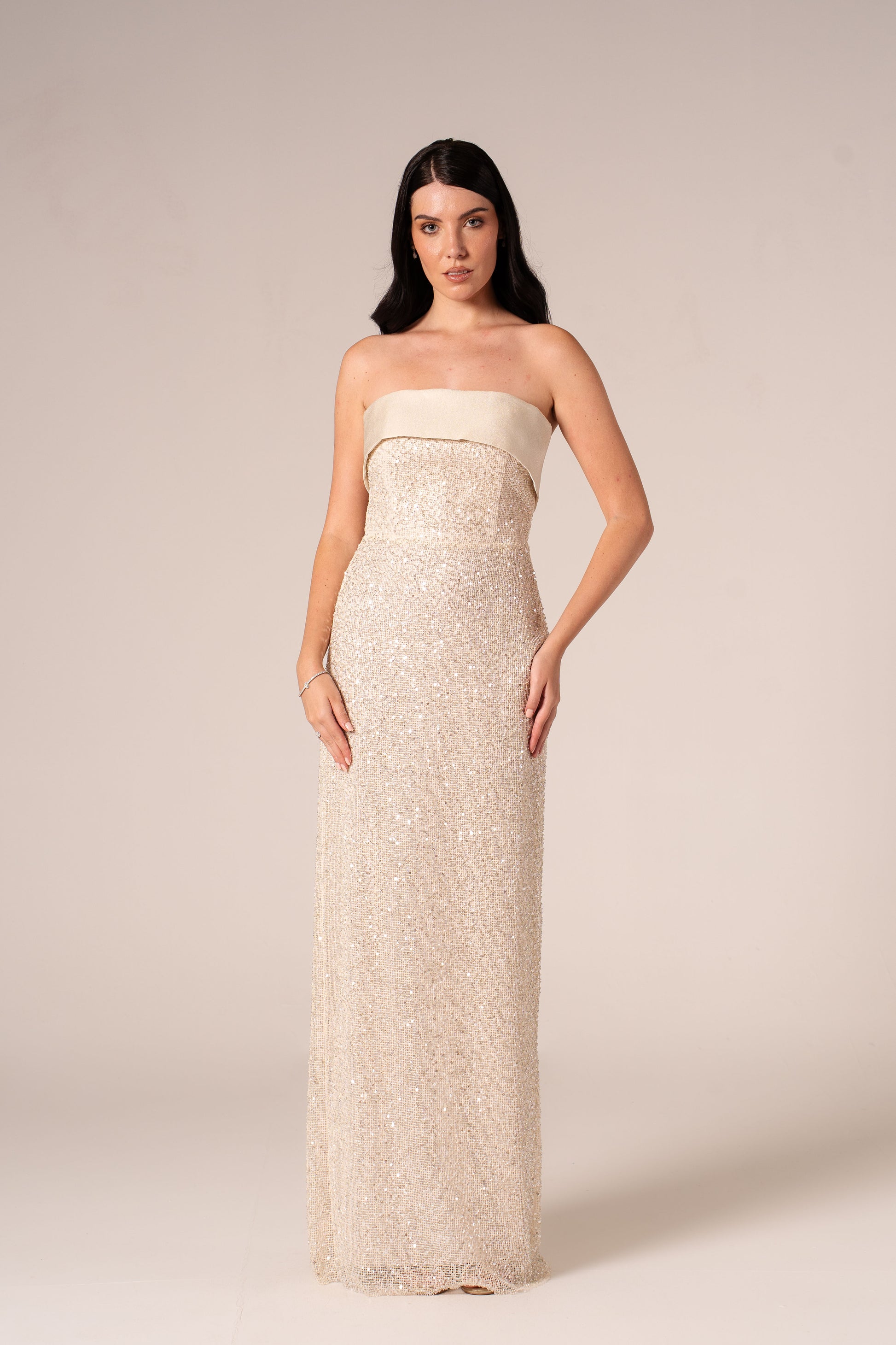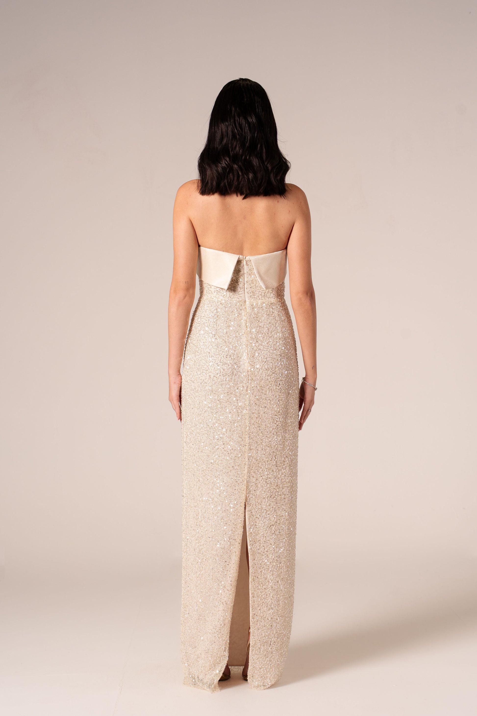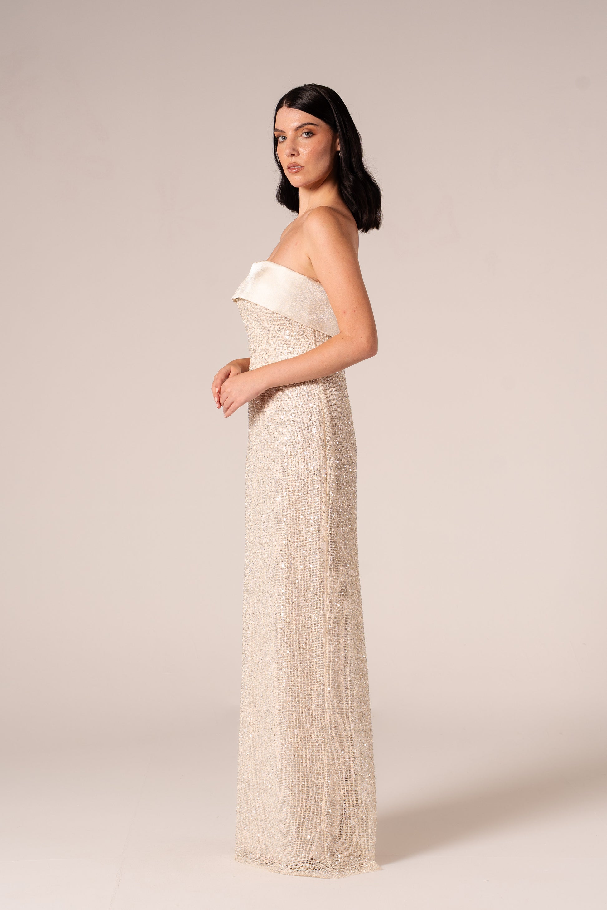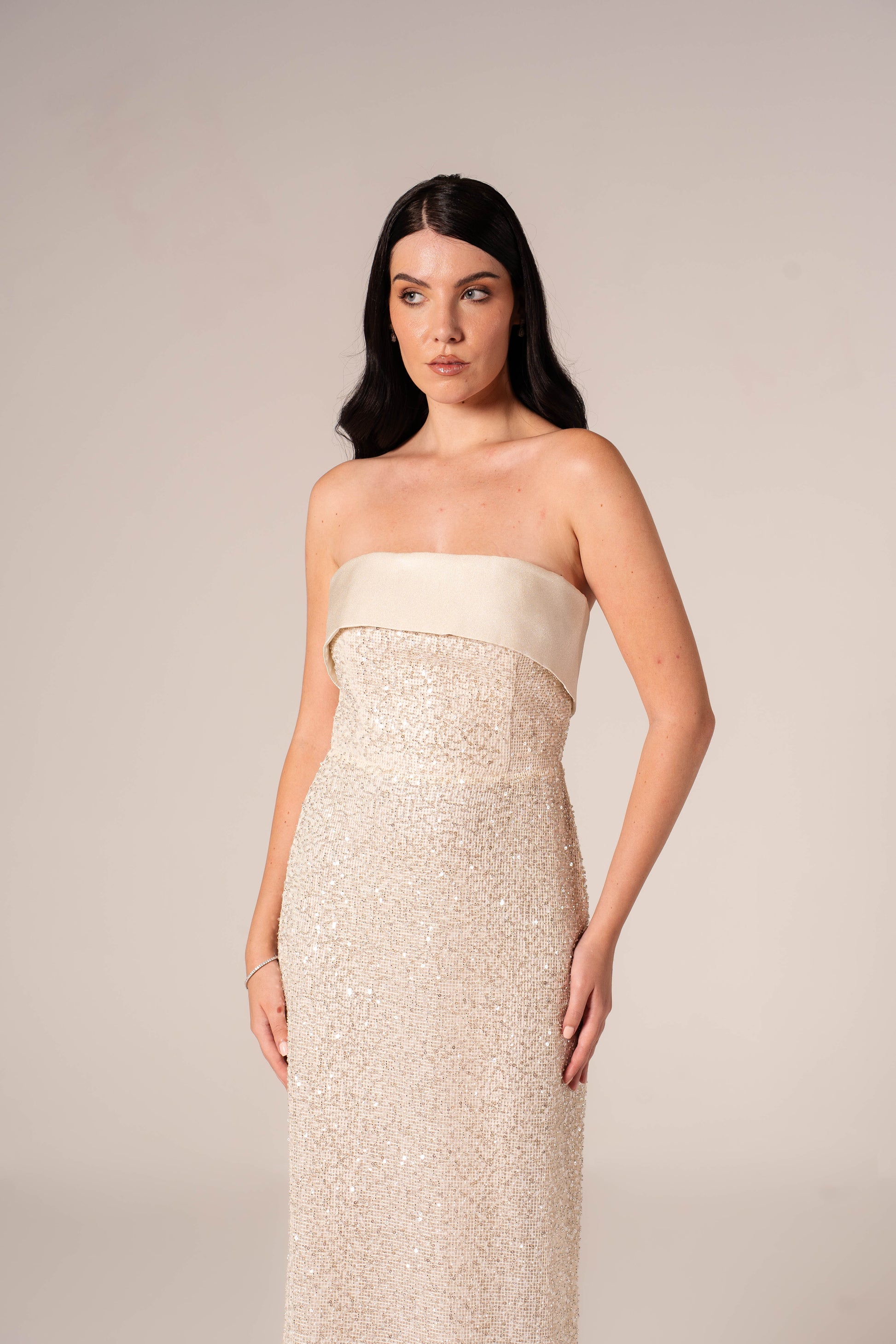 The Sona evening dress combines daring style with luxurious satin fabric embellished with sparkling sequins. Its strapless design showcases your shoulders confidently, making it the perfect choice for making a bold statement at any special occasion.