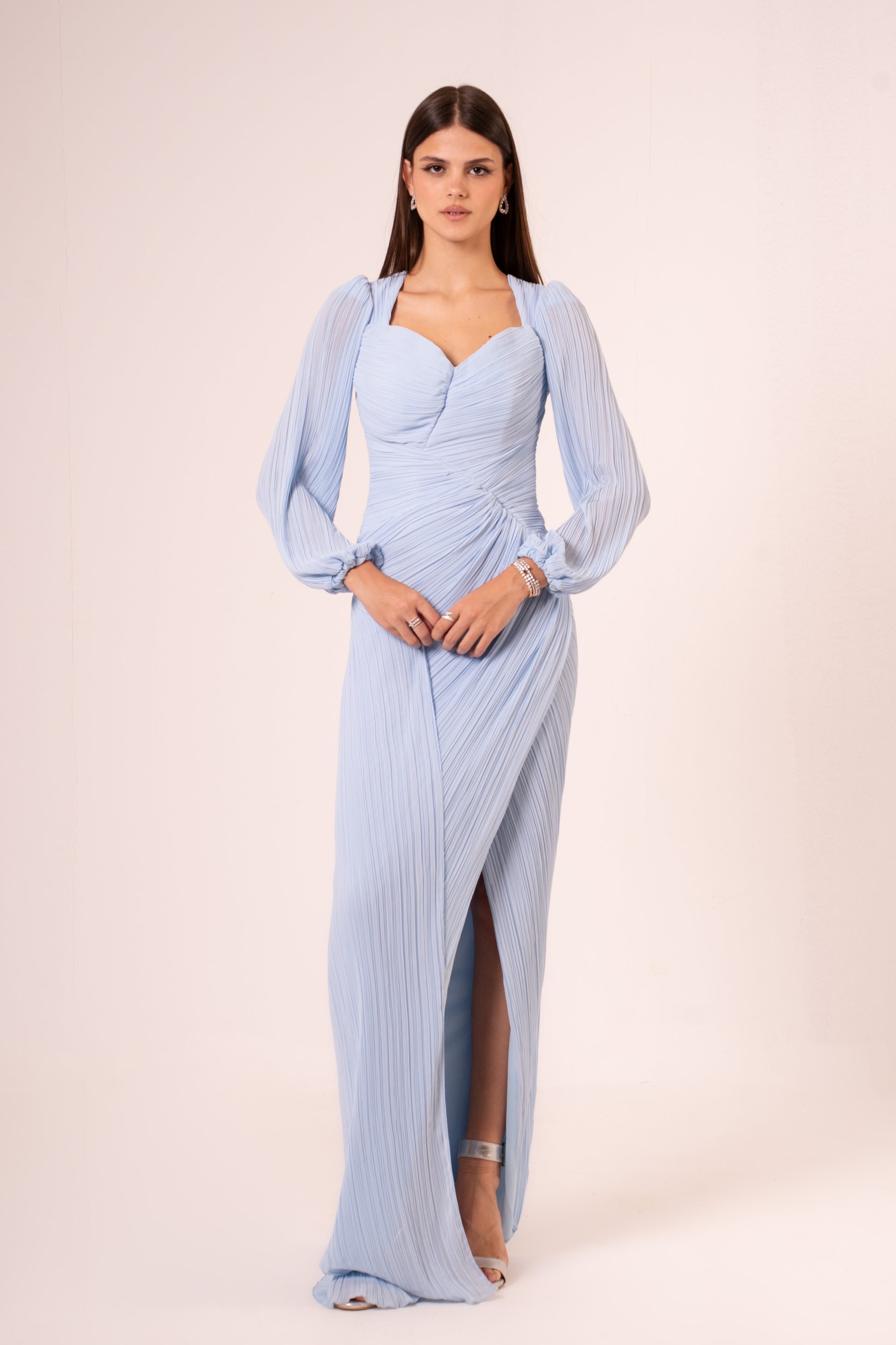 Margot is an elegant long-sleeved maxi evening dress designed for sophisticated occasions. The flowing silhouette features a dramatic high slit that adds movement and allure while maintaining timeless grace. Perfect for formal events, galas, or evening celebrations, this dress combines classic styling with modern elegance. The long sleeves provide refined coverage, while the maxi length creates a stunning floor-sweeping effect. An ideal choice for those seeking a dress that balances modesty with glamorous flair.