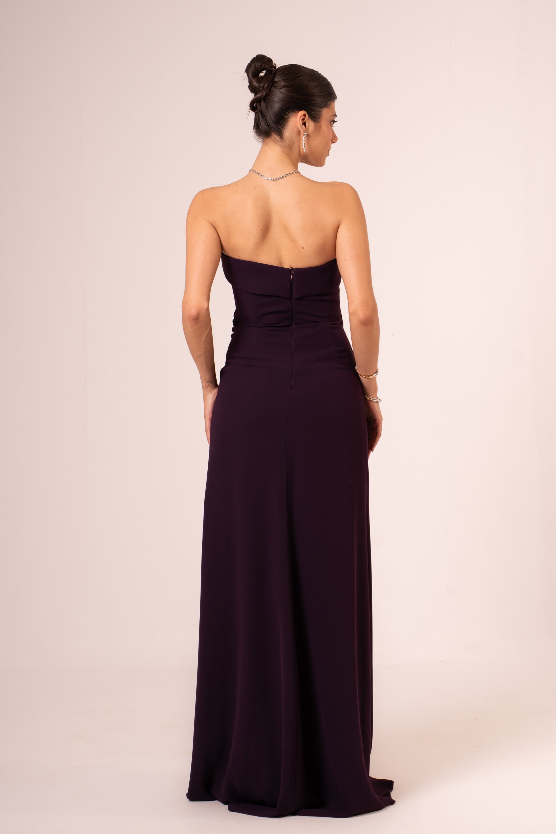 Elegant strapless maxi evening dress designed for sophisticated occasions. The sweetheart neckline frames the shoulders beautifully, while the fitted bodice flows into a graceful skirt. A daring high slit adds movement and allure to the silhouette. Perfect for galas, weddings, and formal celebrations where you want to make a memorable impression.
