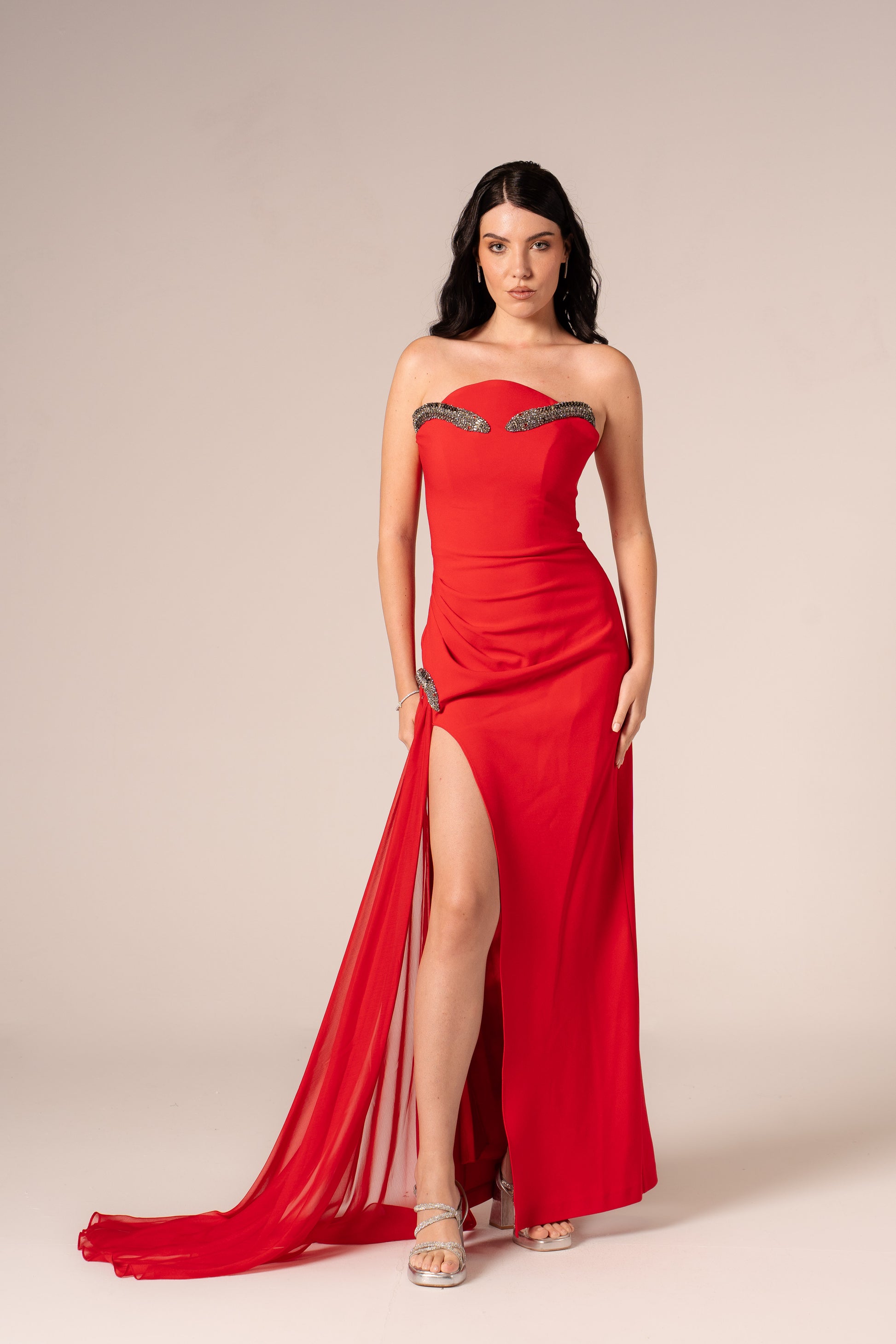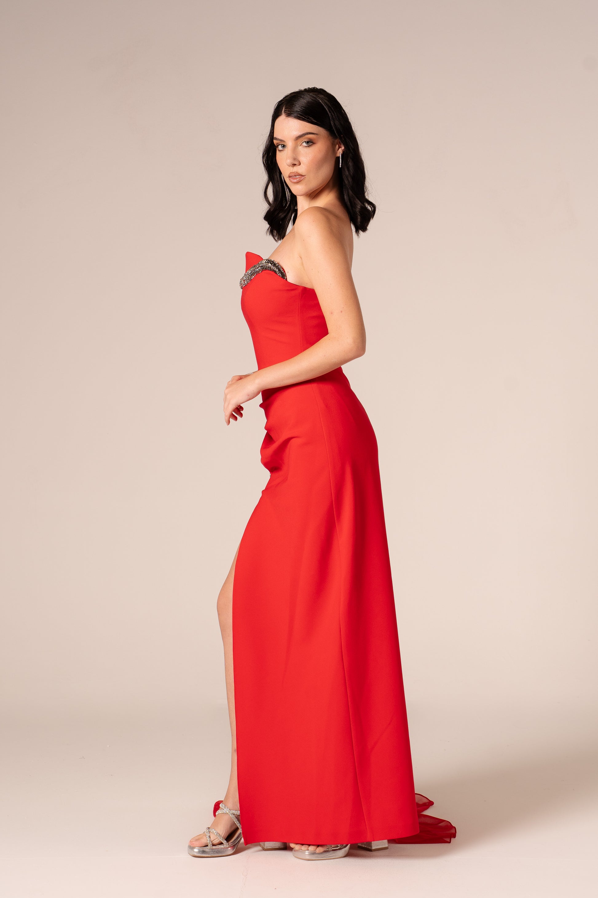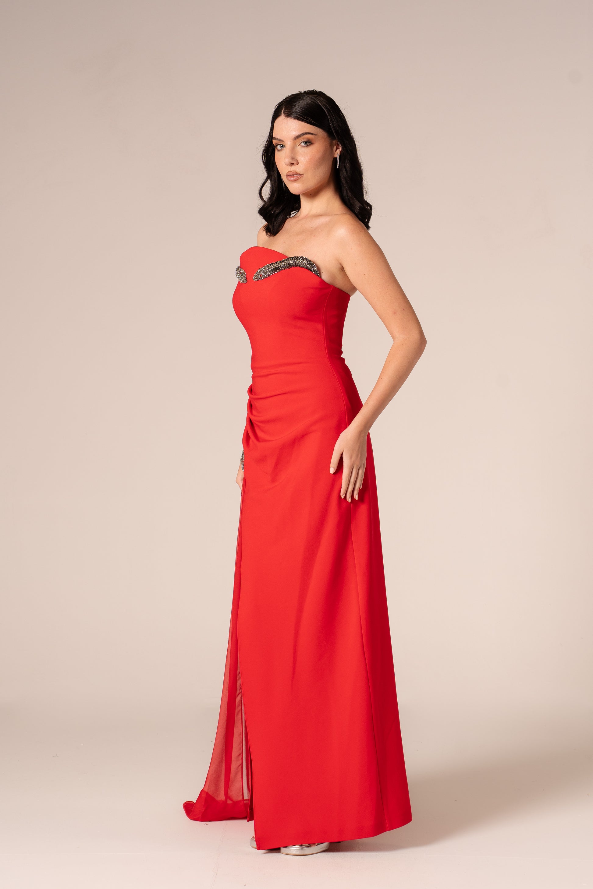Elsinore captures timeless elegance with its strapless silhouette and flowing maxi length, designed to turn heads at any formal occasion. The daring high slit adds a touch of modern sophistication, allowing graceful movement while maintaining an air of mystery. Crafted for those who appreciate bold style without compromising on refinement, this dress transforms you into the focal point of the evening. Perfect for galas, weddings, or upscale celebrations where you want to make an unforgettable impression.