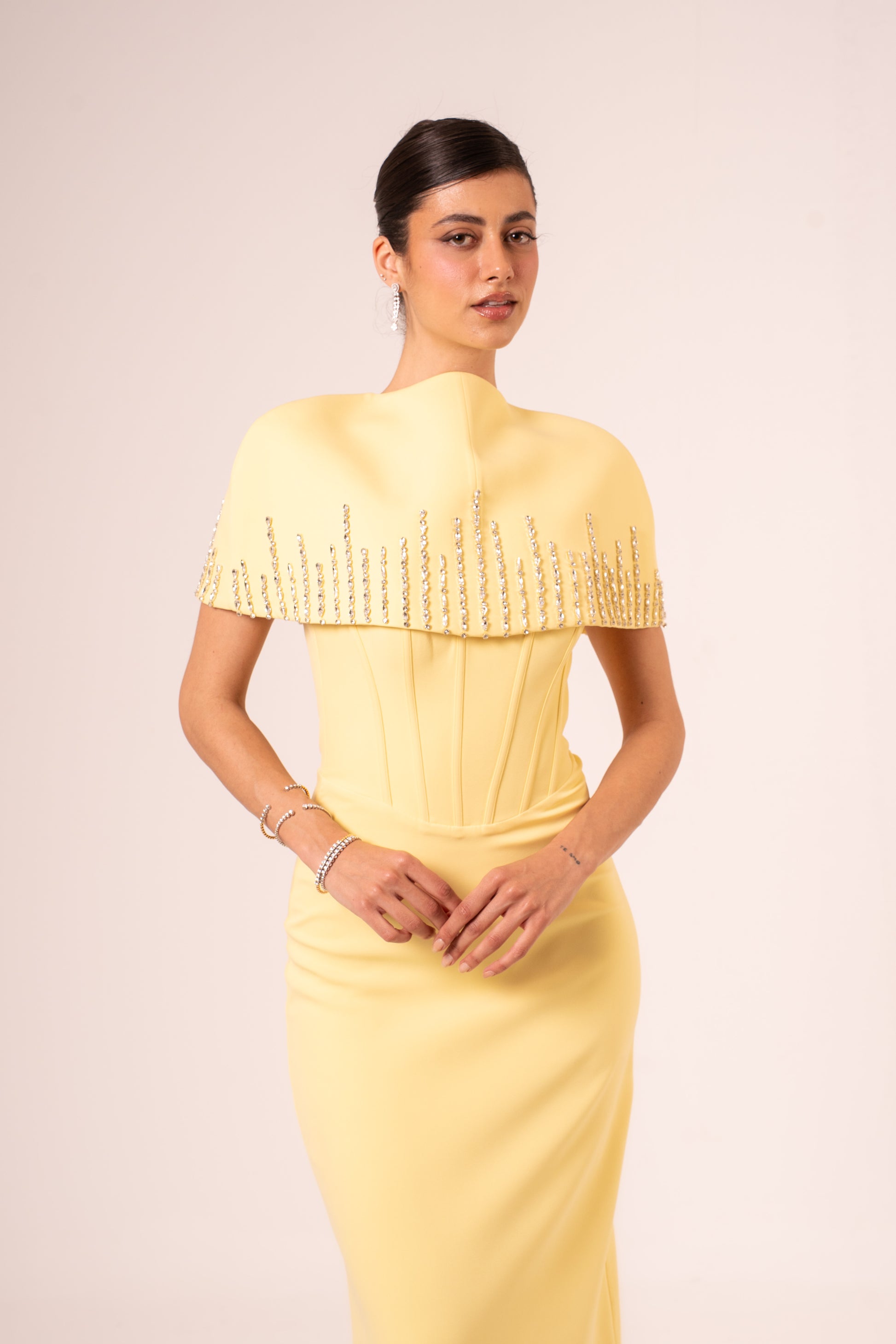 Ghadeer is an elegant sleeveless maxi evening dress designed for sophisticated occasions. The flowing silhouette drapes gracefully from the shoulders to the floor, creating a timeless and refined look. Perfect for weddings, galas, and formal celebrations, this dress combines comfort with understated luxury. The sleeveless design offers a modern touch while maintaining classic elegance, making it an ideal choice for evening wear that commands attention without compromise.