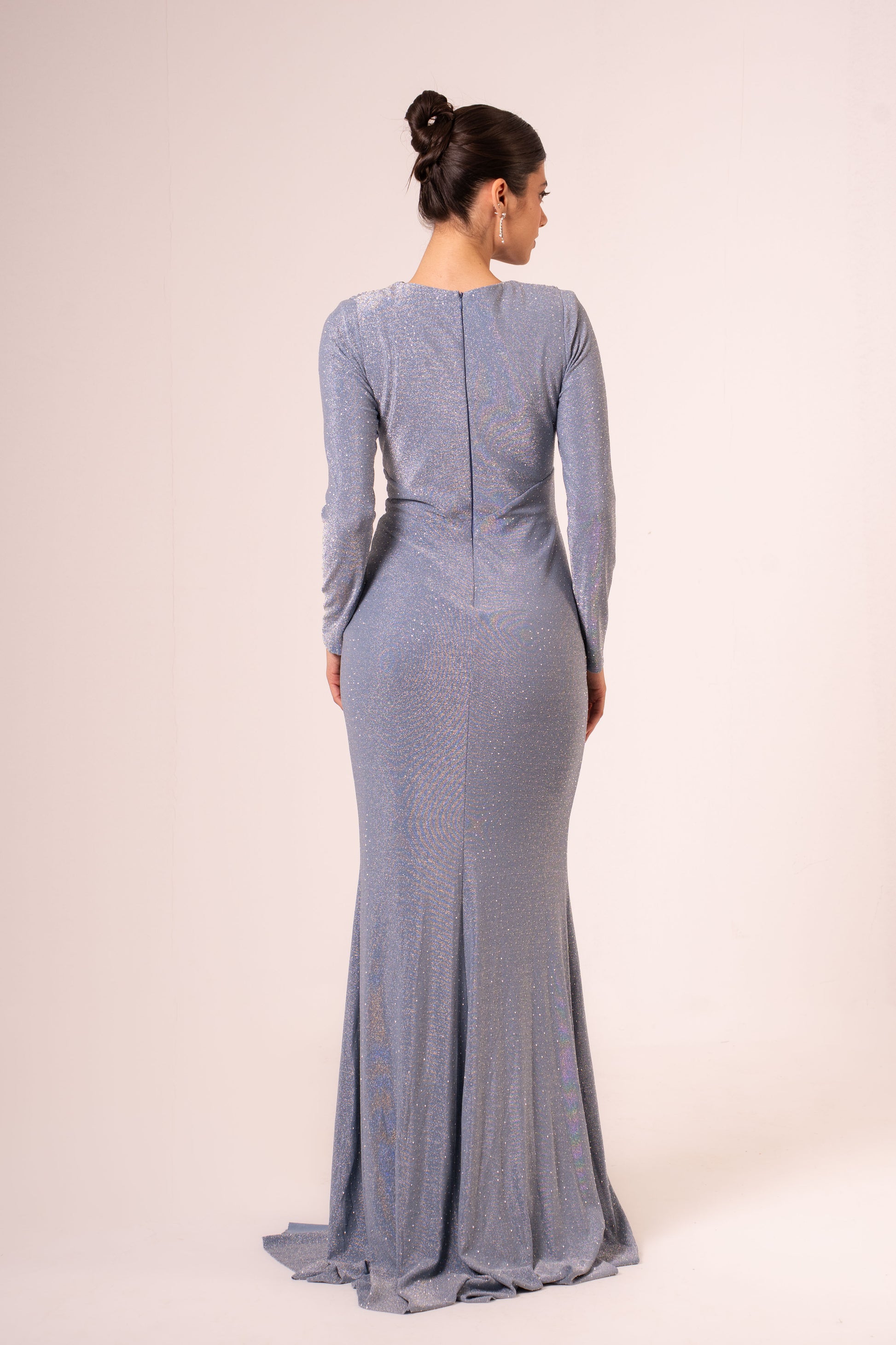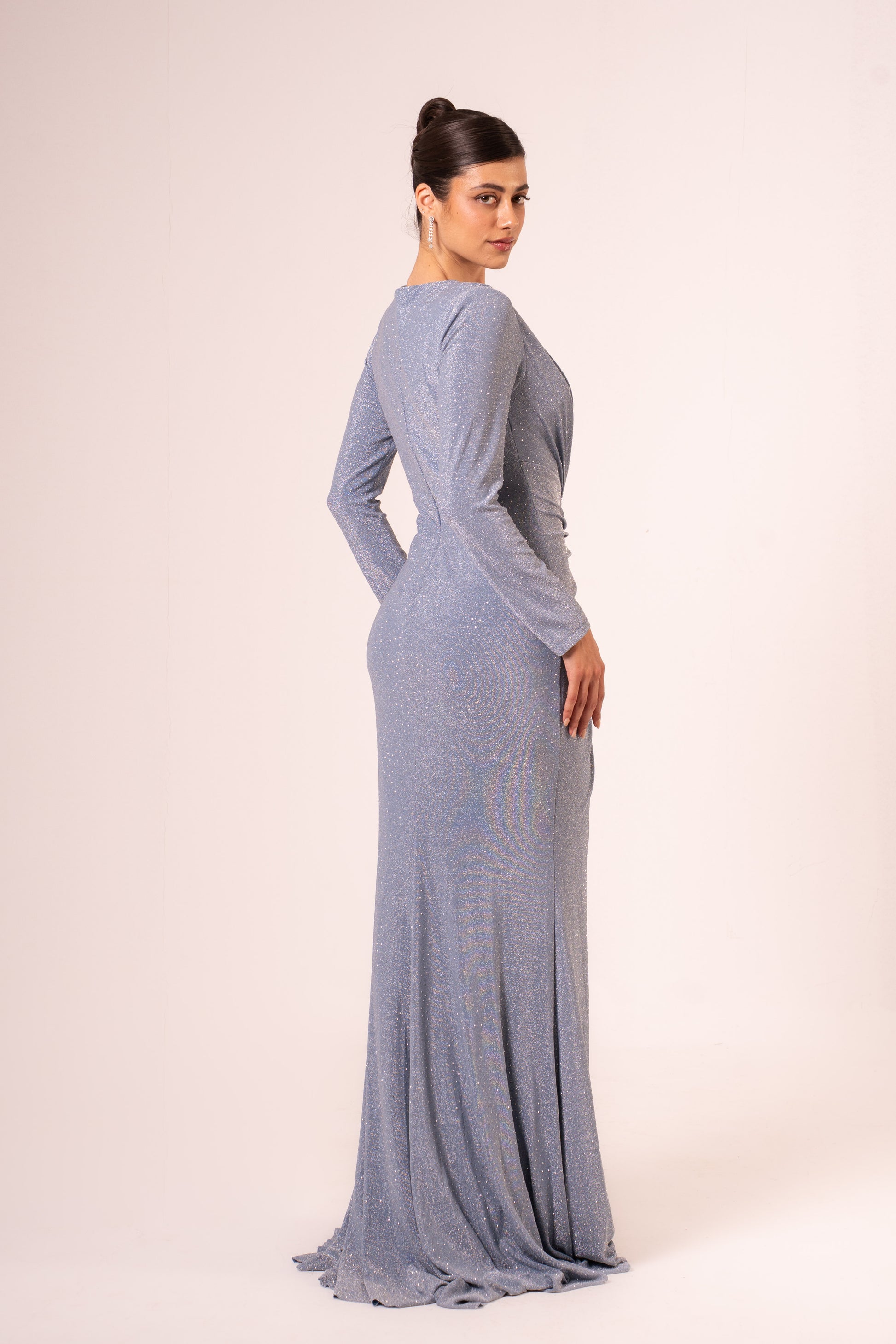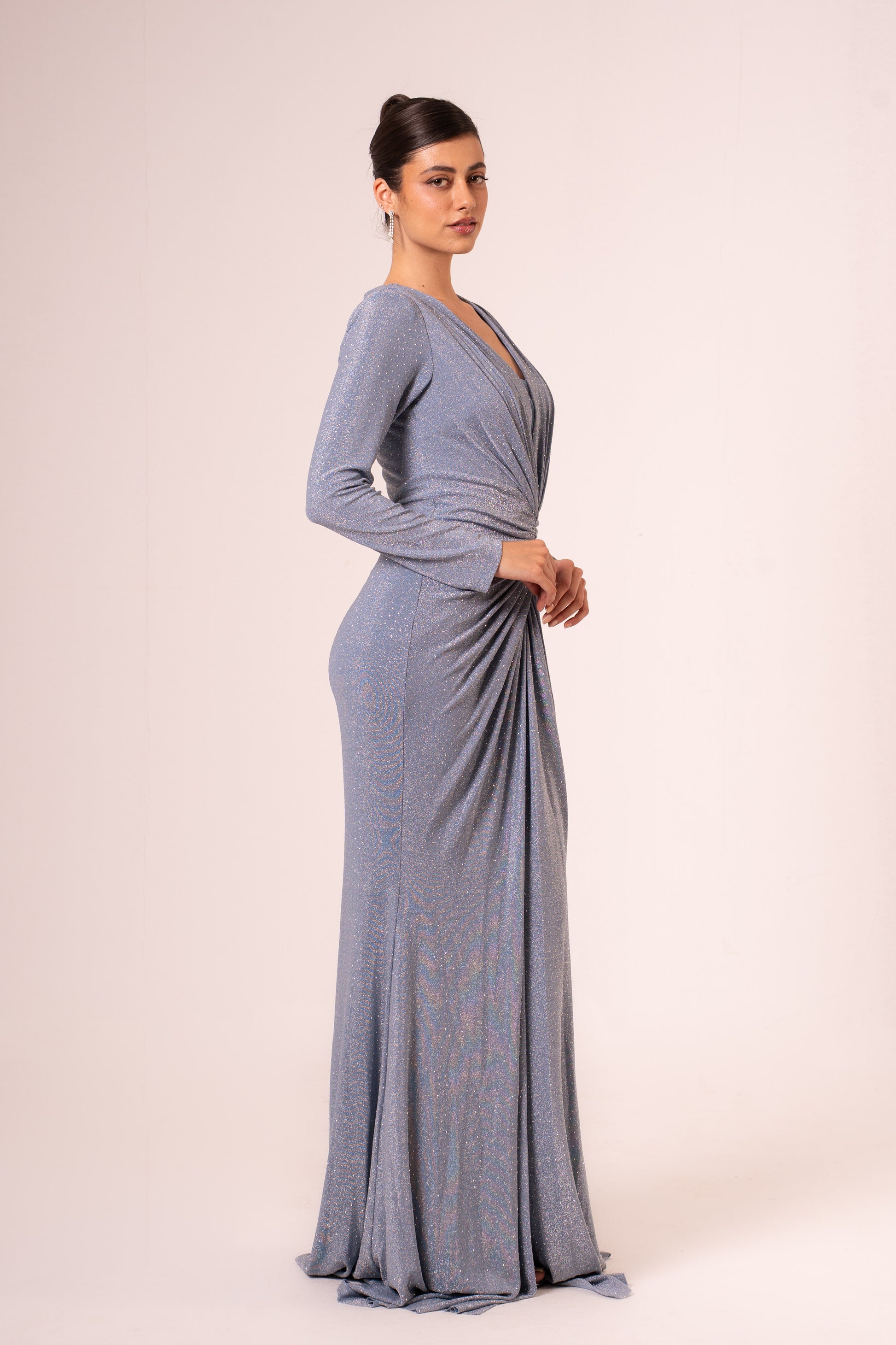Introducing Mariselle, an elegant long-sleeved maxi evening dress crafted from luxurious draped material. The flowing fabric creates a sophisticated silhouette that moves gracefully with every step, perfect for formal occasions and special events. The generous sleeves provide modest coverage while maintaining an effortlessly chic aesthetic. This timeless piece combines comfort with refined style, making it an essential addition to any evening wardrobe. Ideal for those seeking understated elegance and graceful movement.