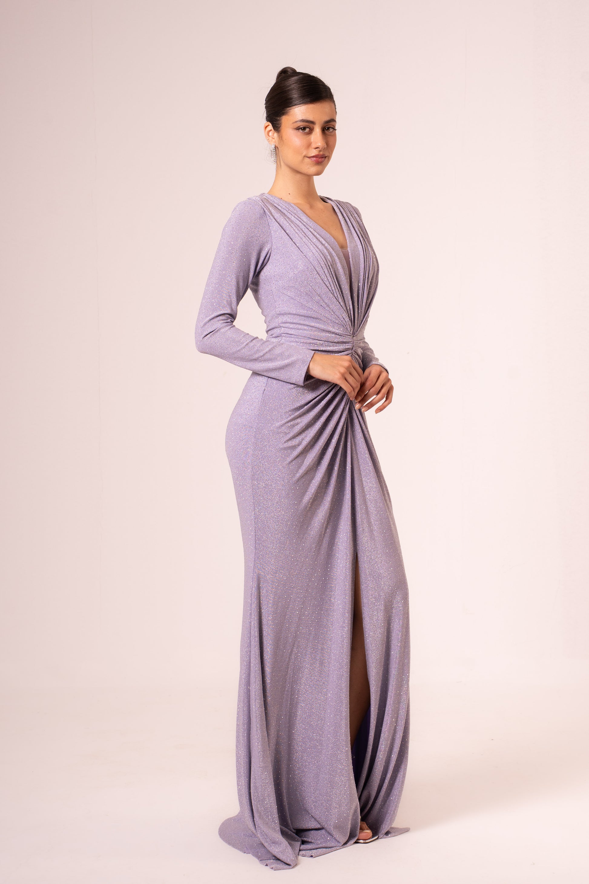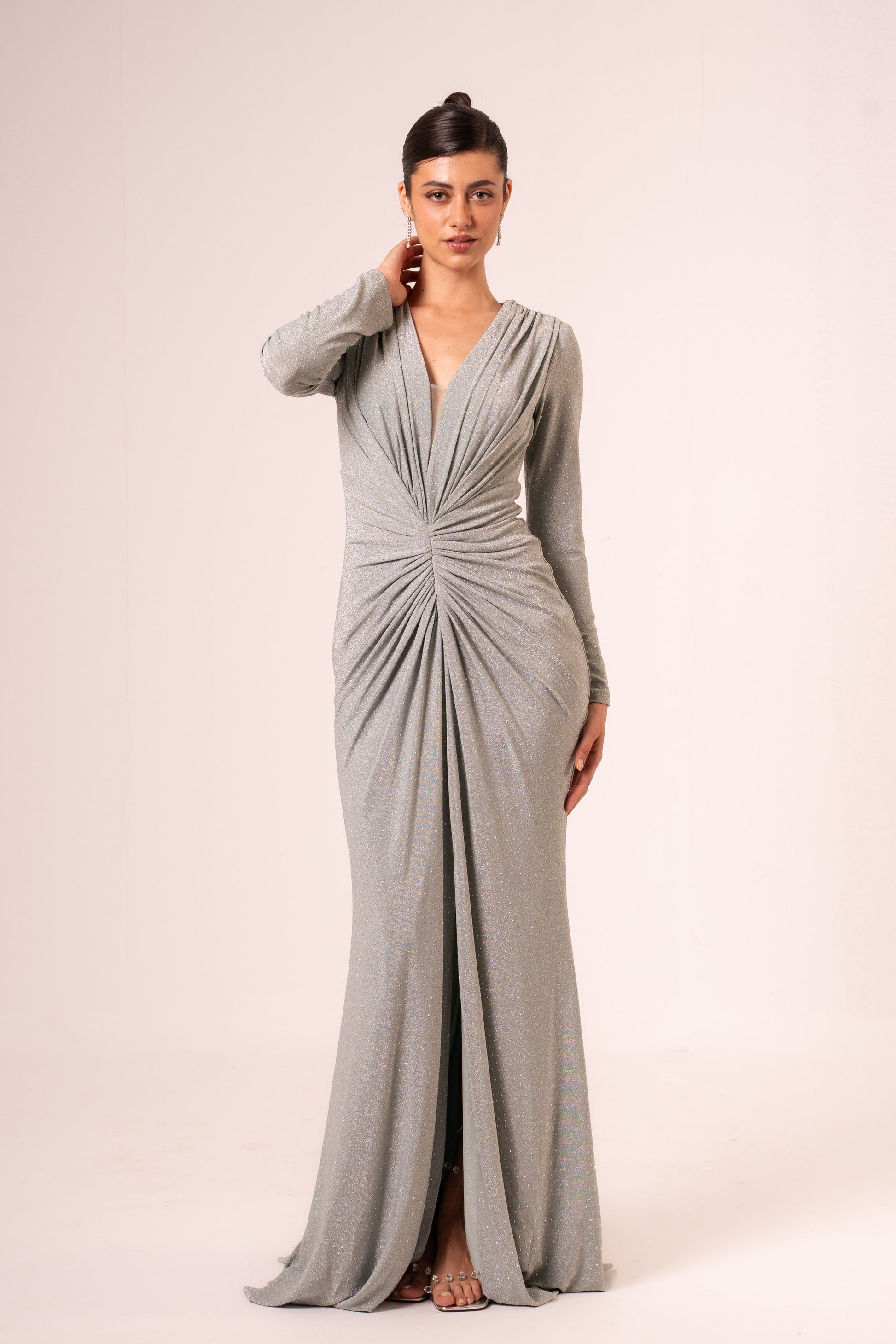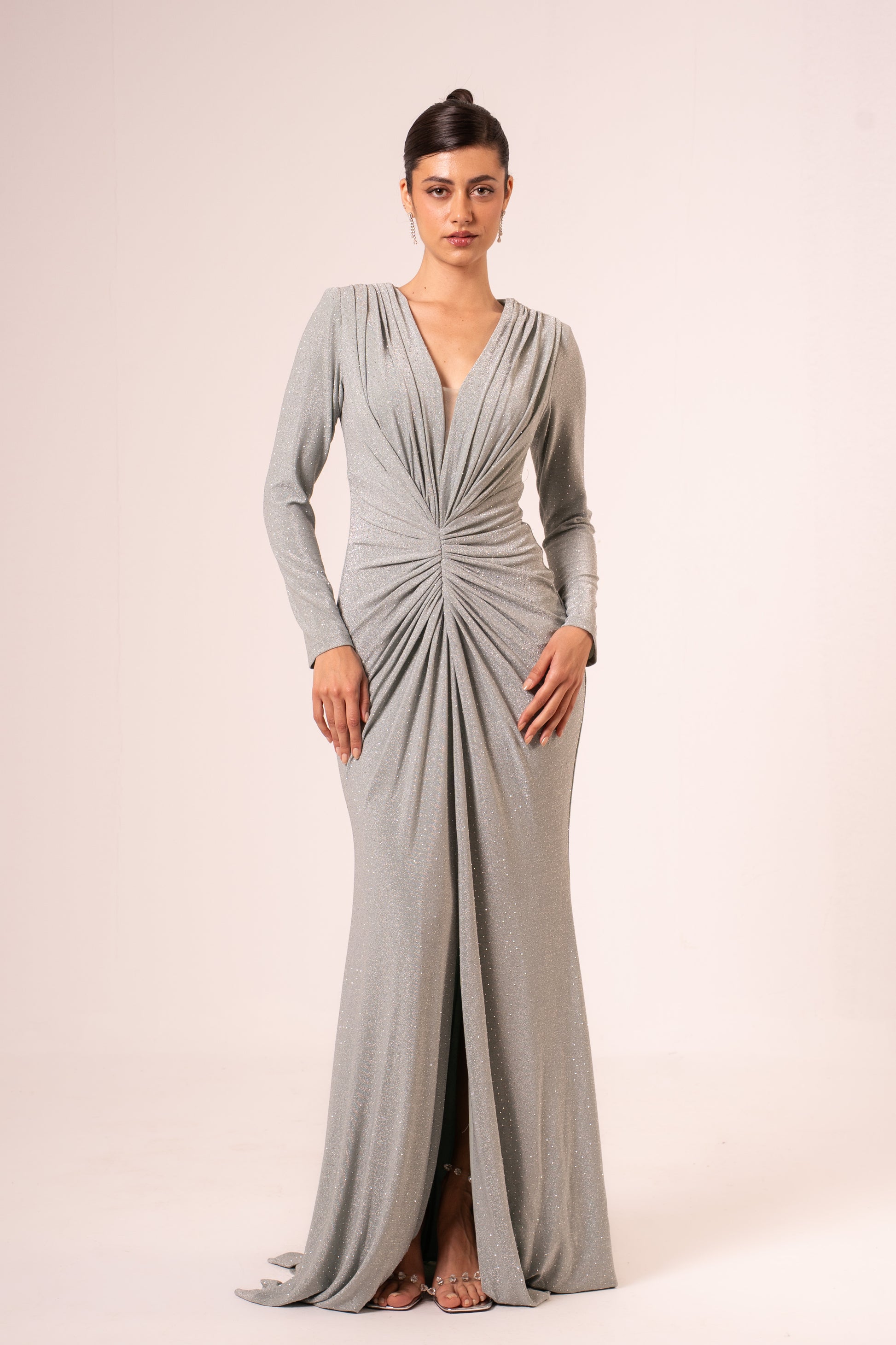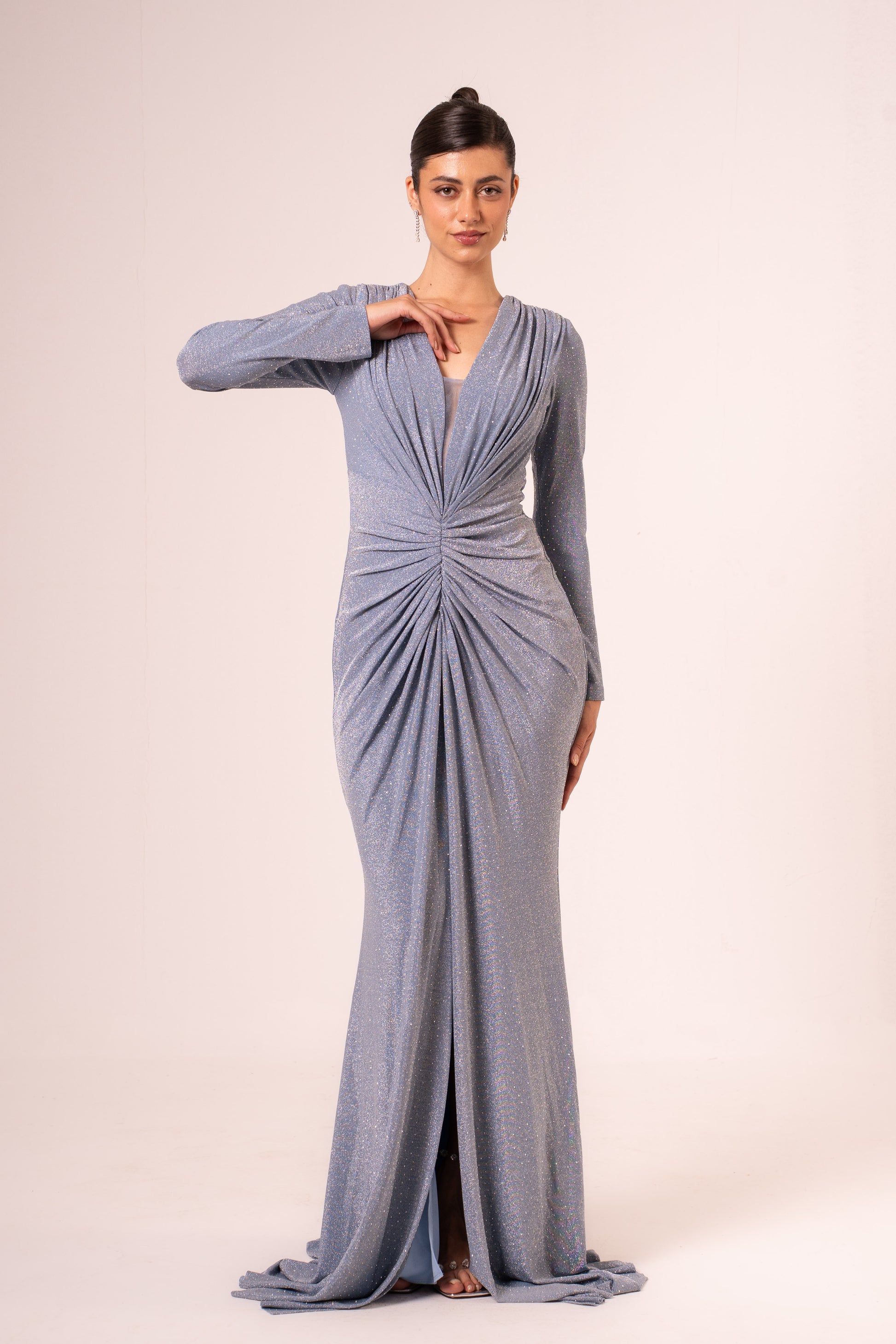 Introducing Mariselle, an elegant long-sleeved maxi evening dress crafted from luxurious draped material. The flowing fabric creates a sophisticated silhouette that moves gracefully with every step, perfect for formal occasions and special events. The generous sleeves provide modest coverage while maintaining an effortlessly chic aesthetic. This timeless piece combines comfort with refined style, making it an essential addition to any evening wardrobe. Ideal for those seeking understated elegance and graceful movement.