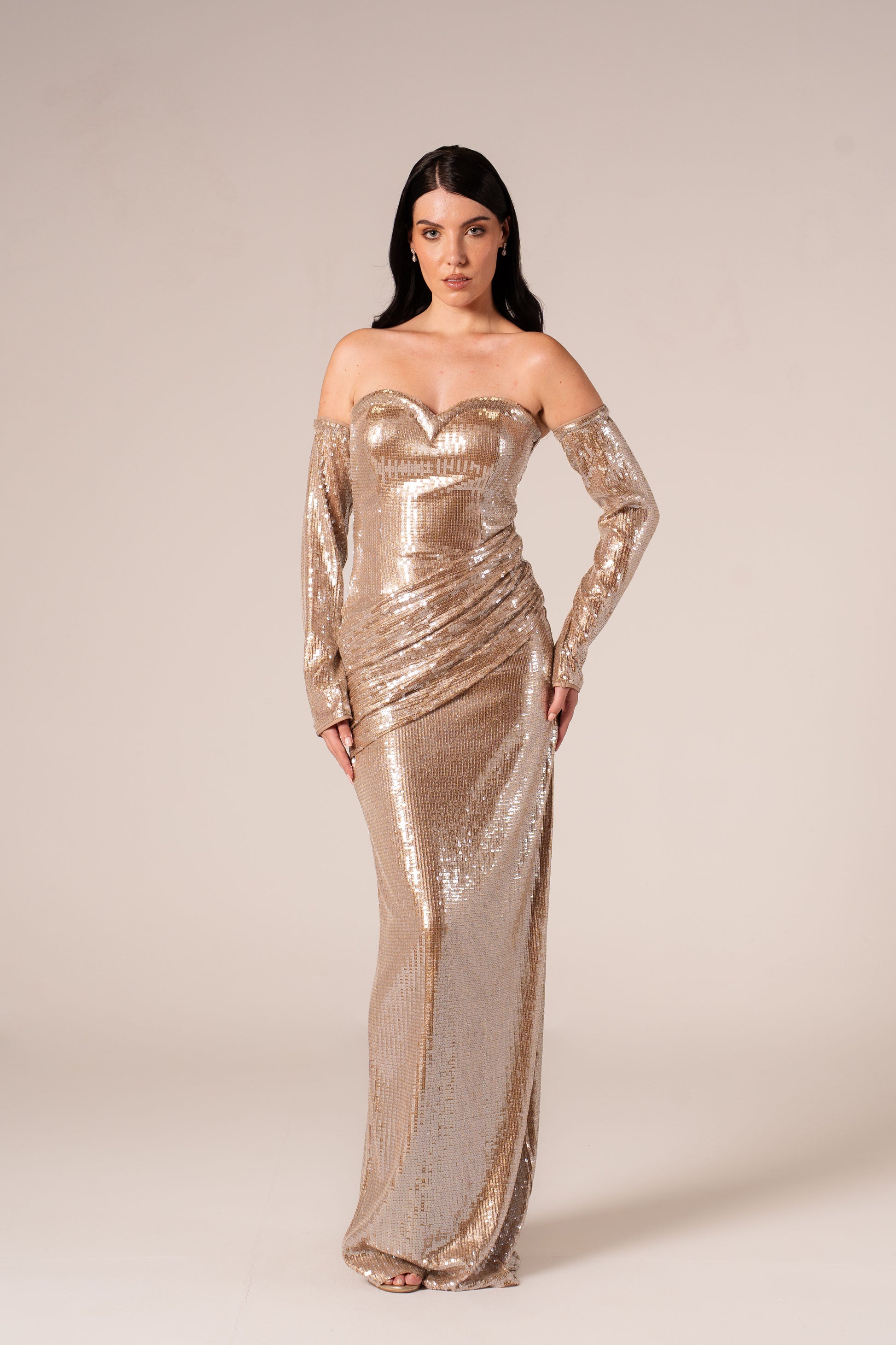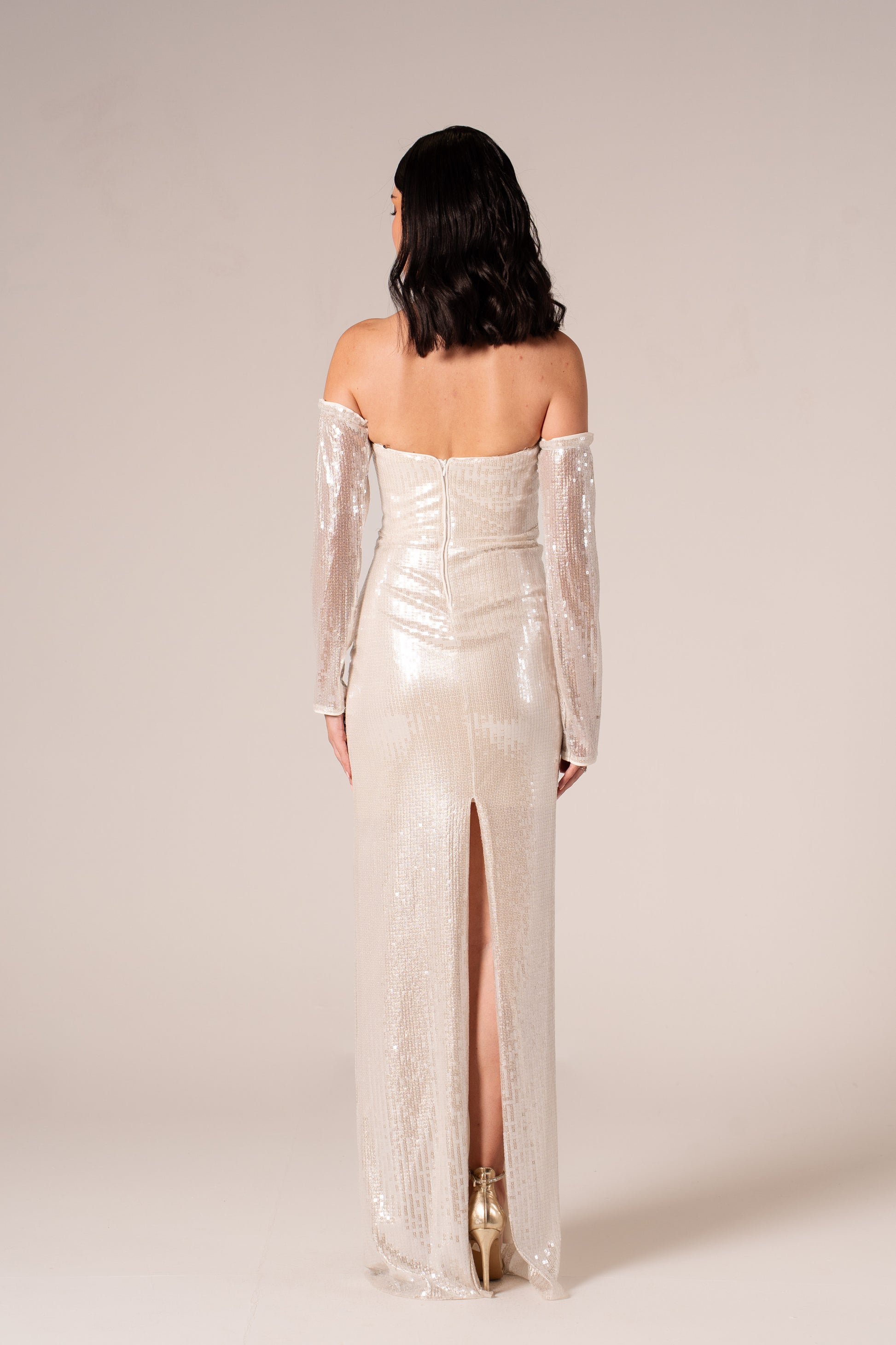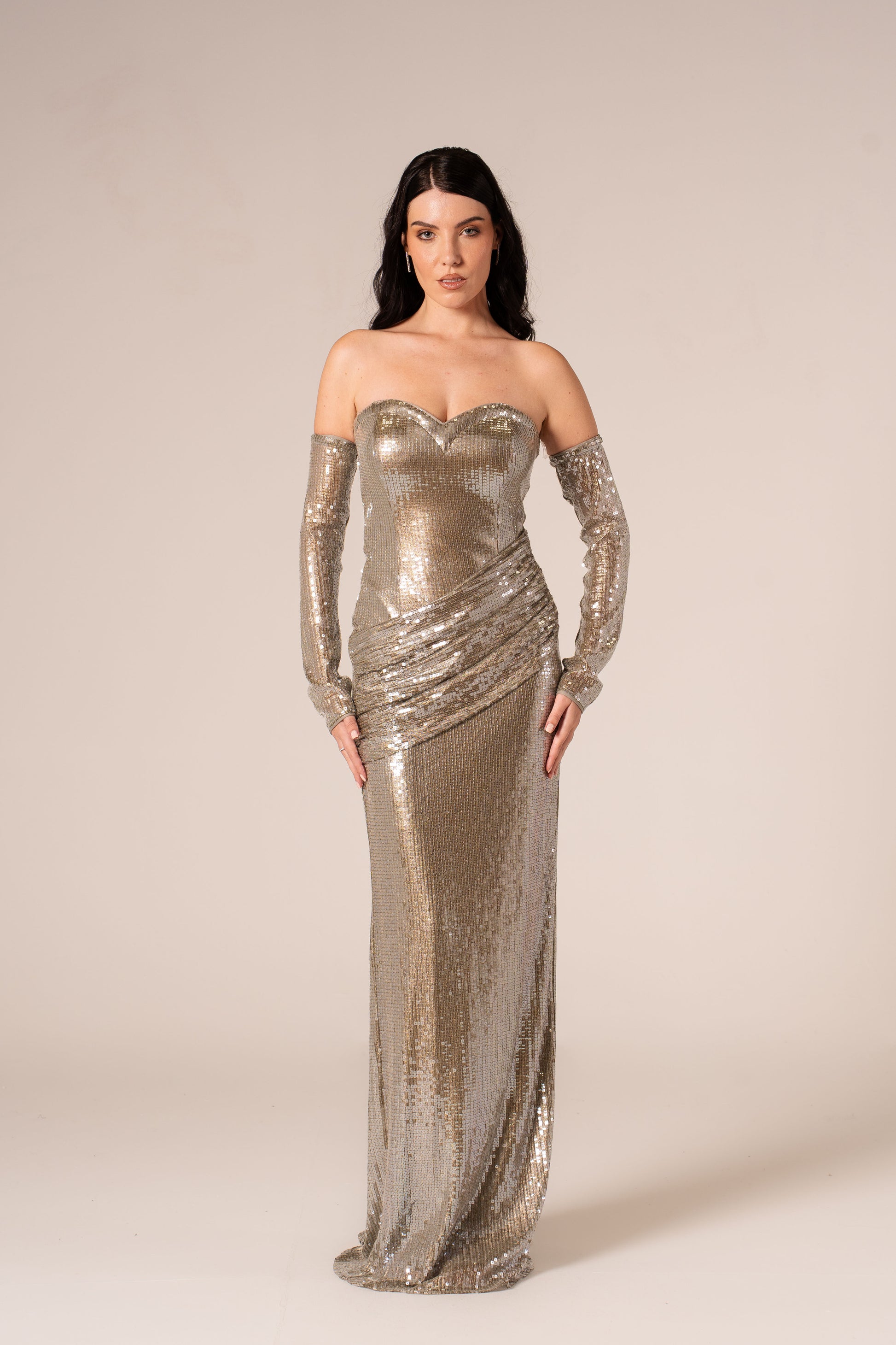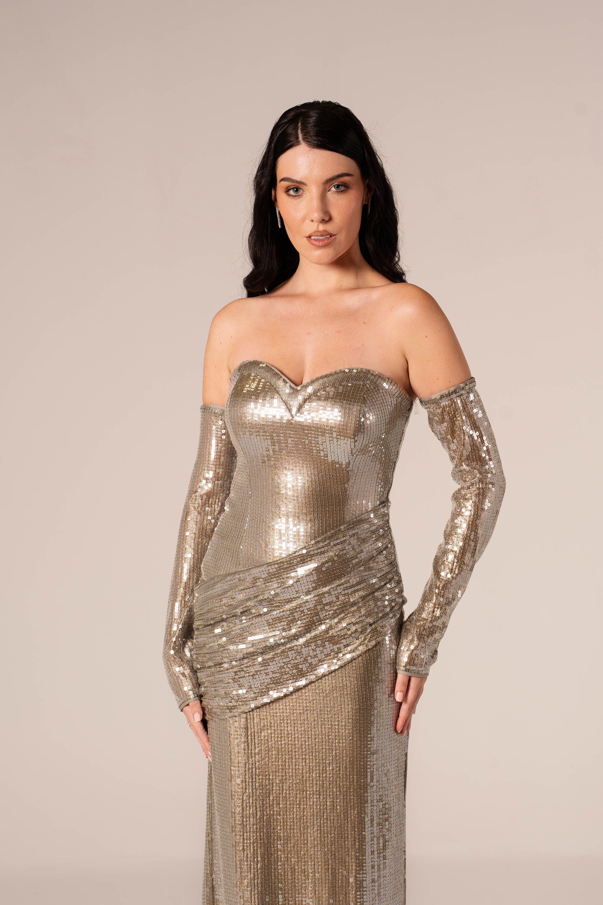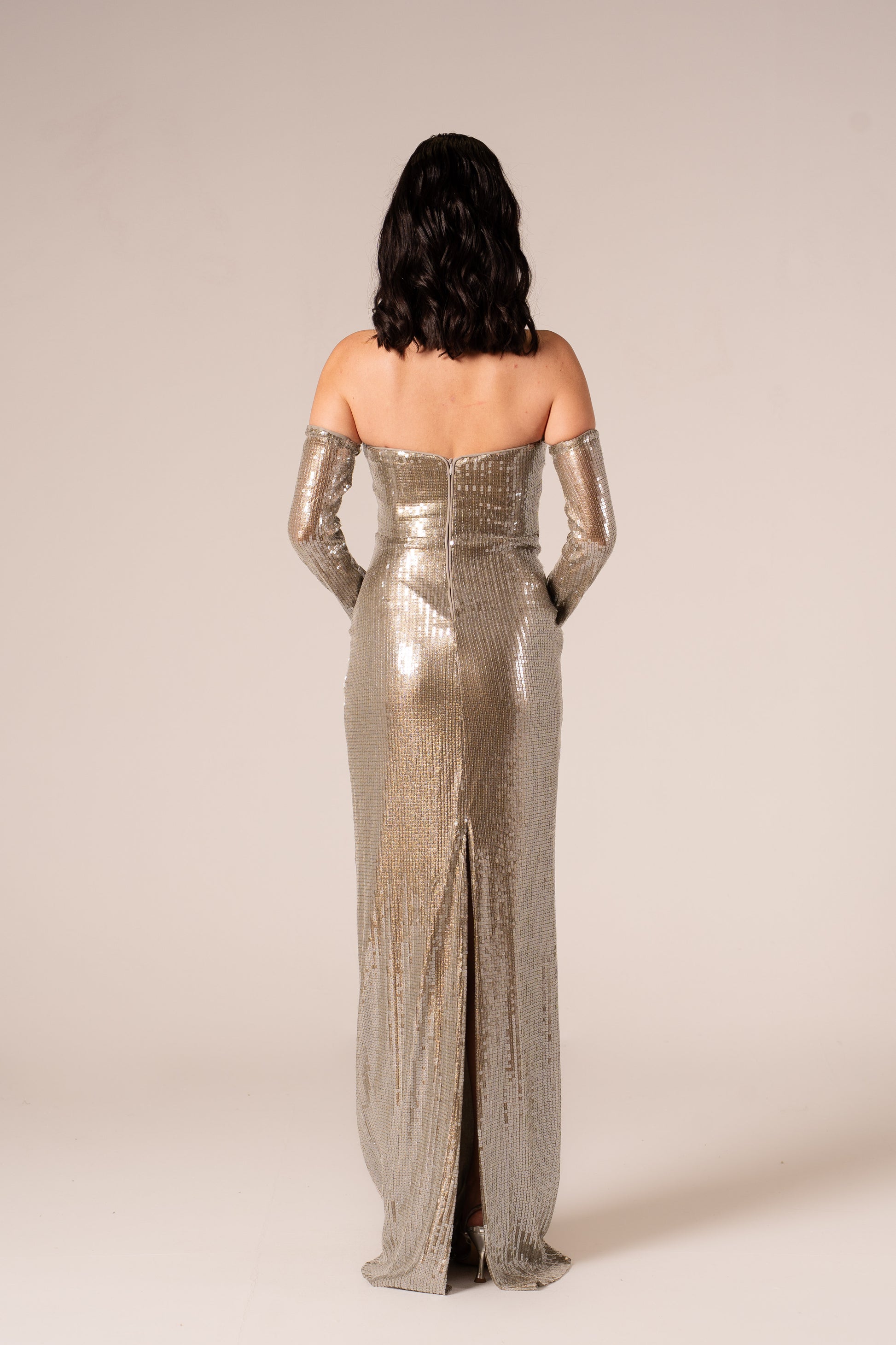 Quintina is the ultimate statement piece for unforgettable evenings. This strapless maxi dress combines timeless elegance with modern sophistication, featuring a sleek silhouette that flatters every figure. The separated sleeves add an unexpected touch of drama and movement, while the high slit creates an alluring glimpse of leg with every step. Perfect for galas, weddings, or any occasion where you want to command attention, this dress transforms you into the most captivating person in the room. Embrace your confidence and let Quintina do the talking.