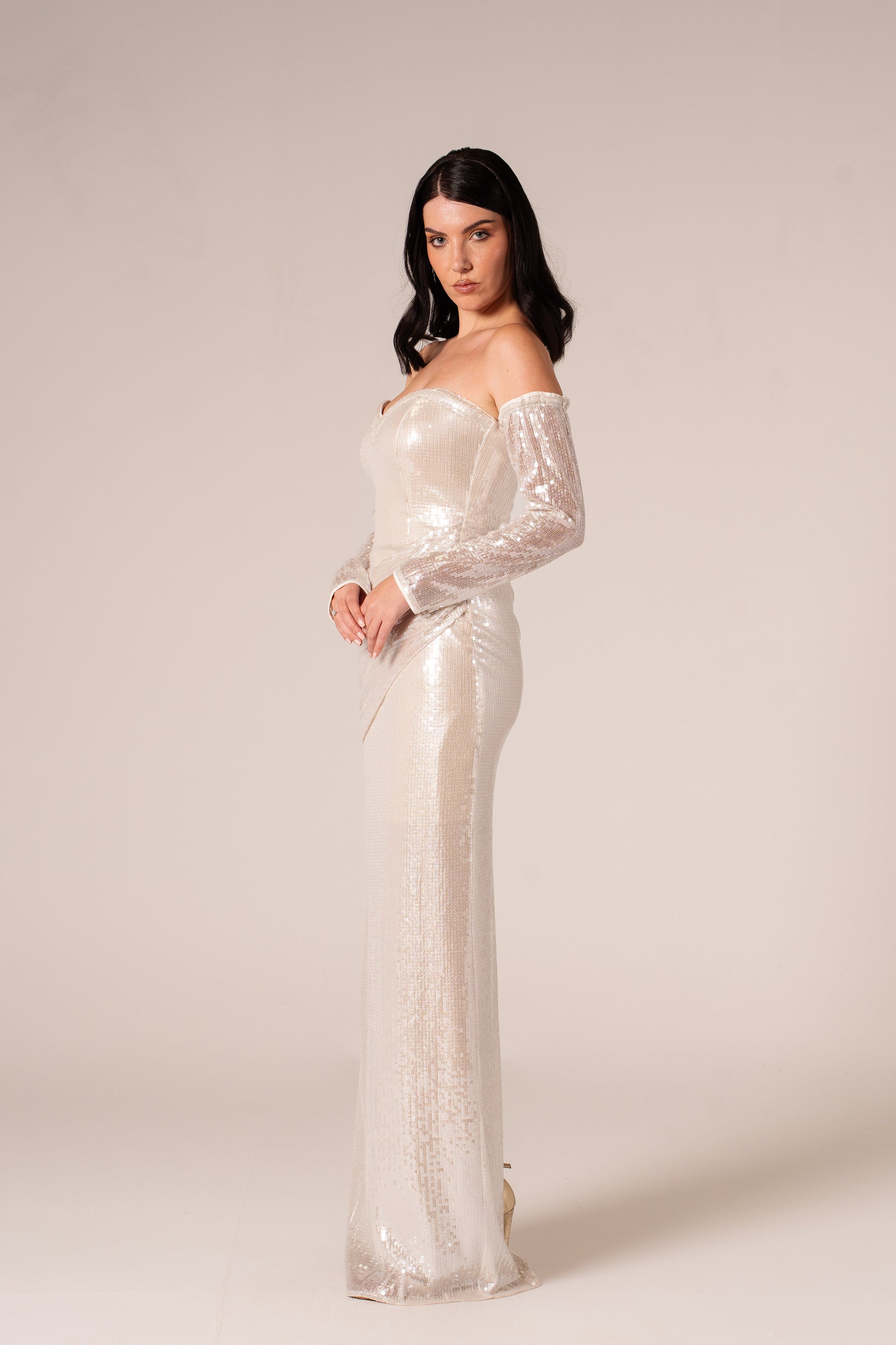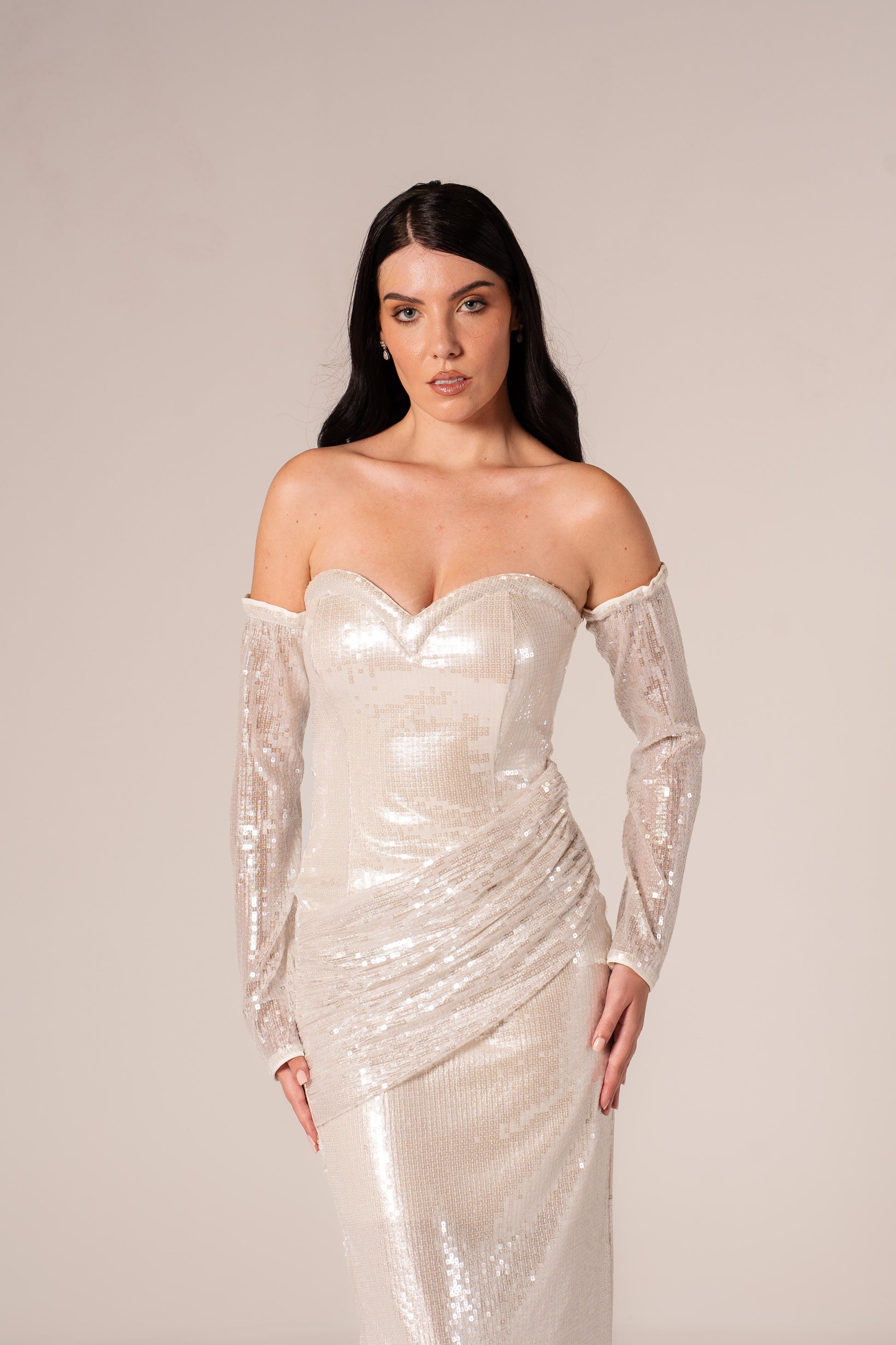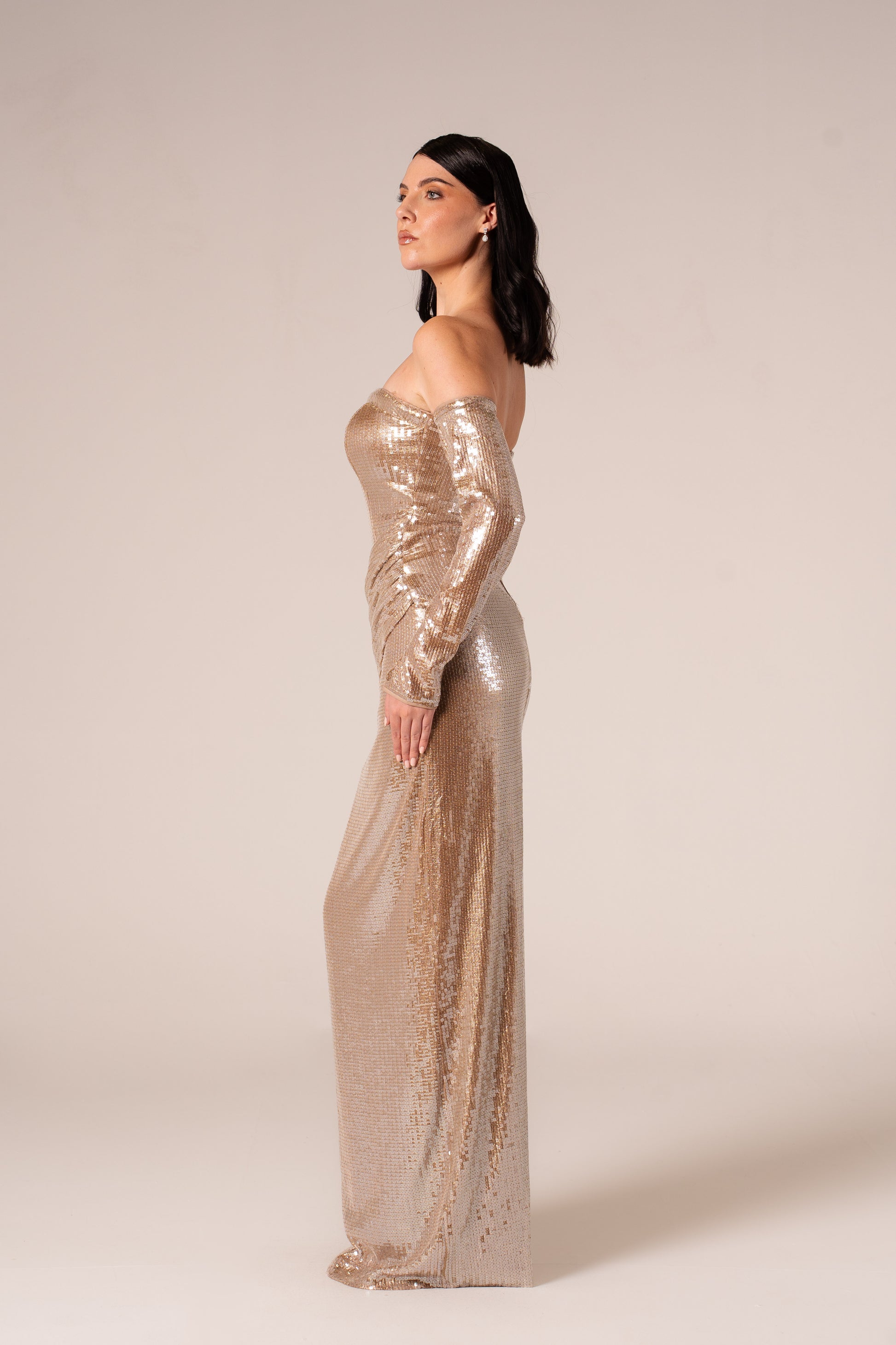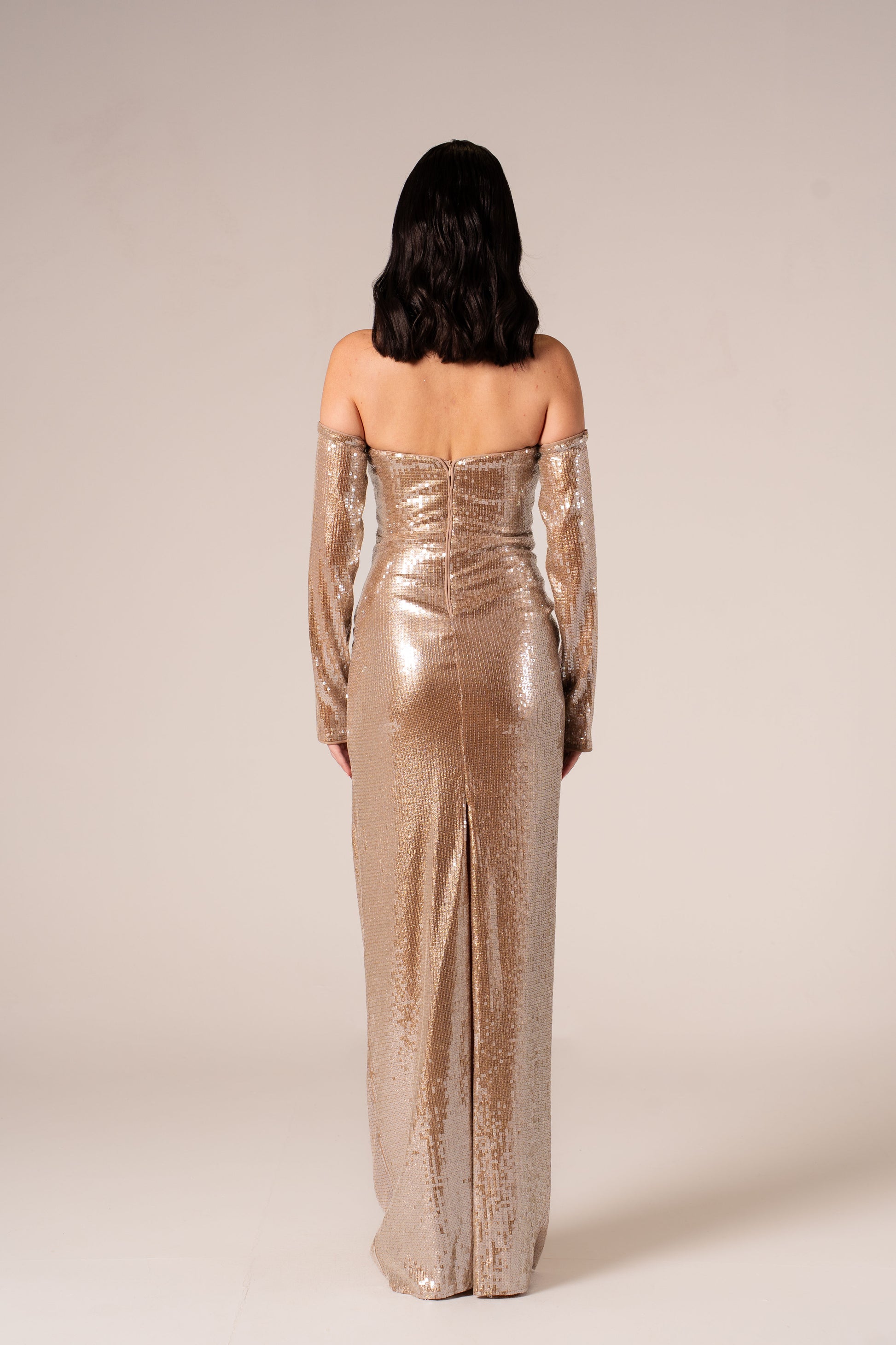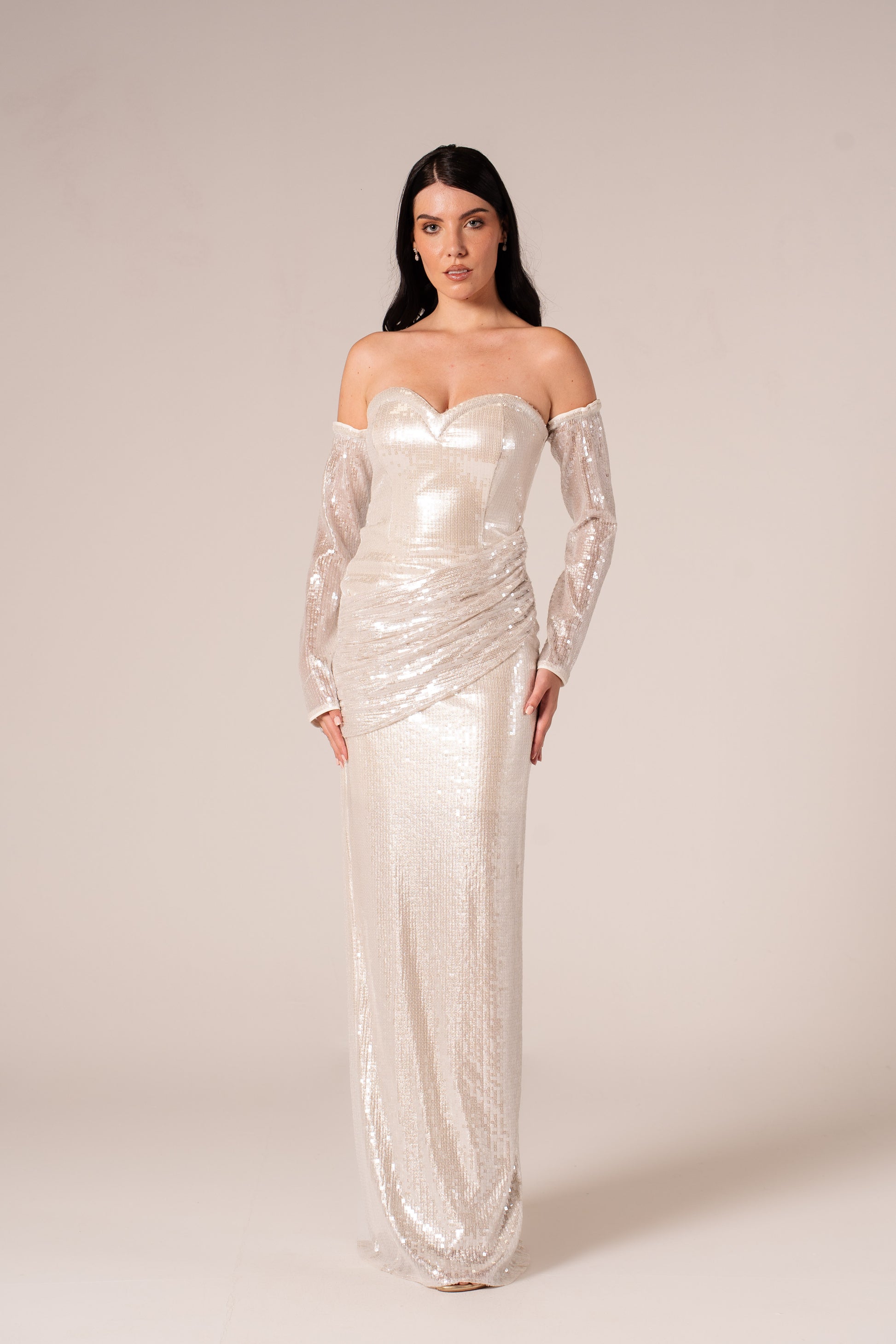 Quintina is the ultimate statement piece for unforgettable evenings. This strapless maxi dress combines timeless elegance with modern sophistication, featuring a sleek silhouette that flatters every figure. The separated sleeves add an unexpected touch of drama and movement, while the high slit creates an alluring glimpse of leg with every step. Perfect for galas, weddings, or any occasion where you want to command attention, this dress transforms you into the most captivating person in the room. Embrace your confidence and let Quintina do the talking.