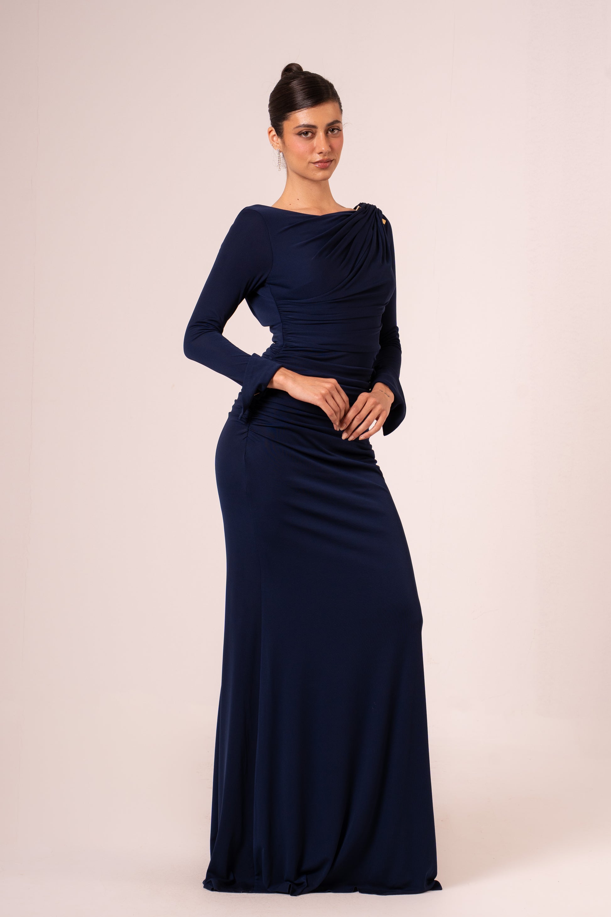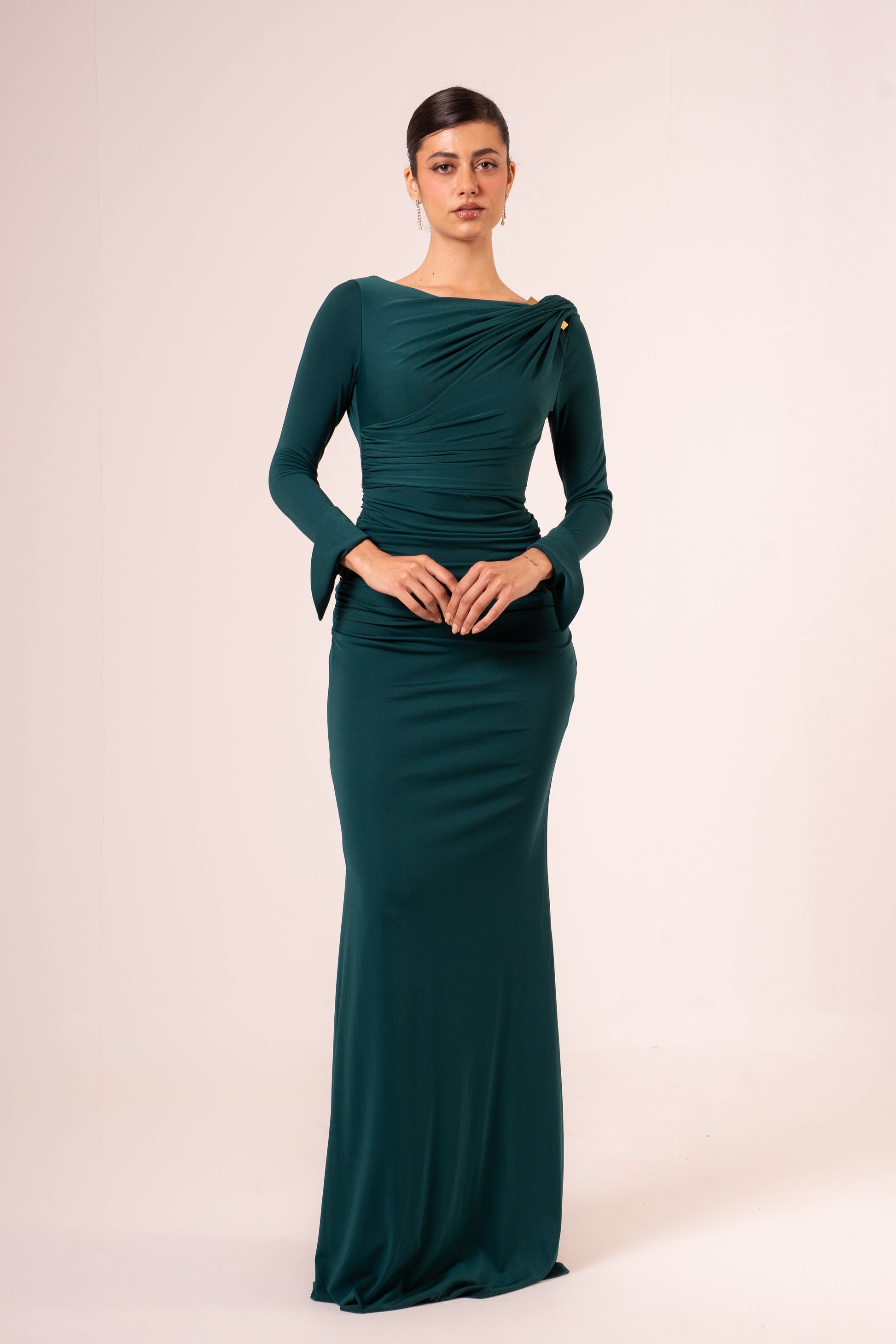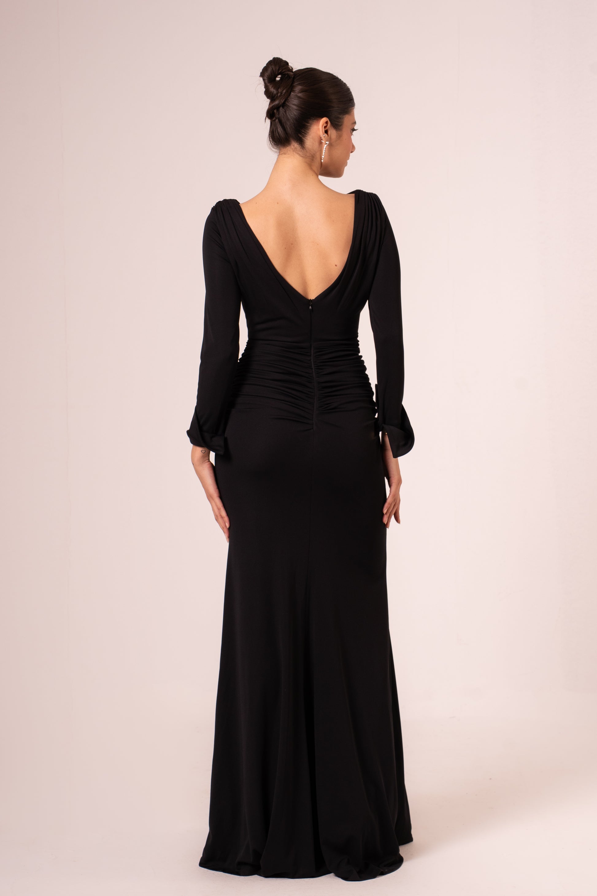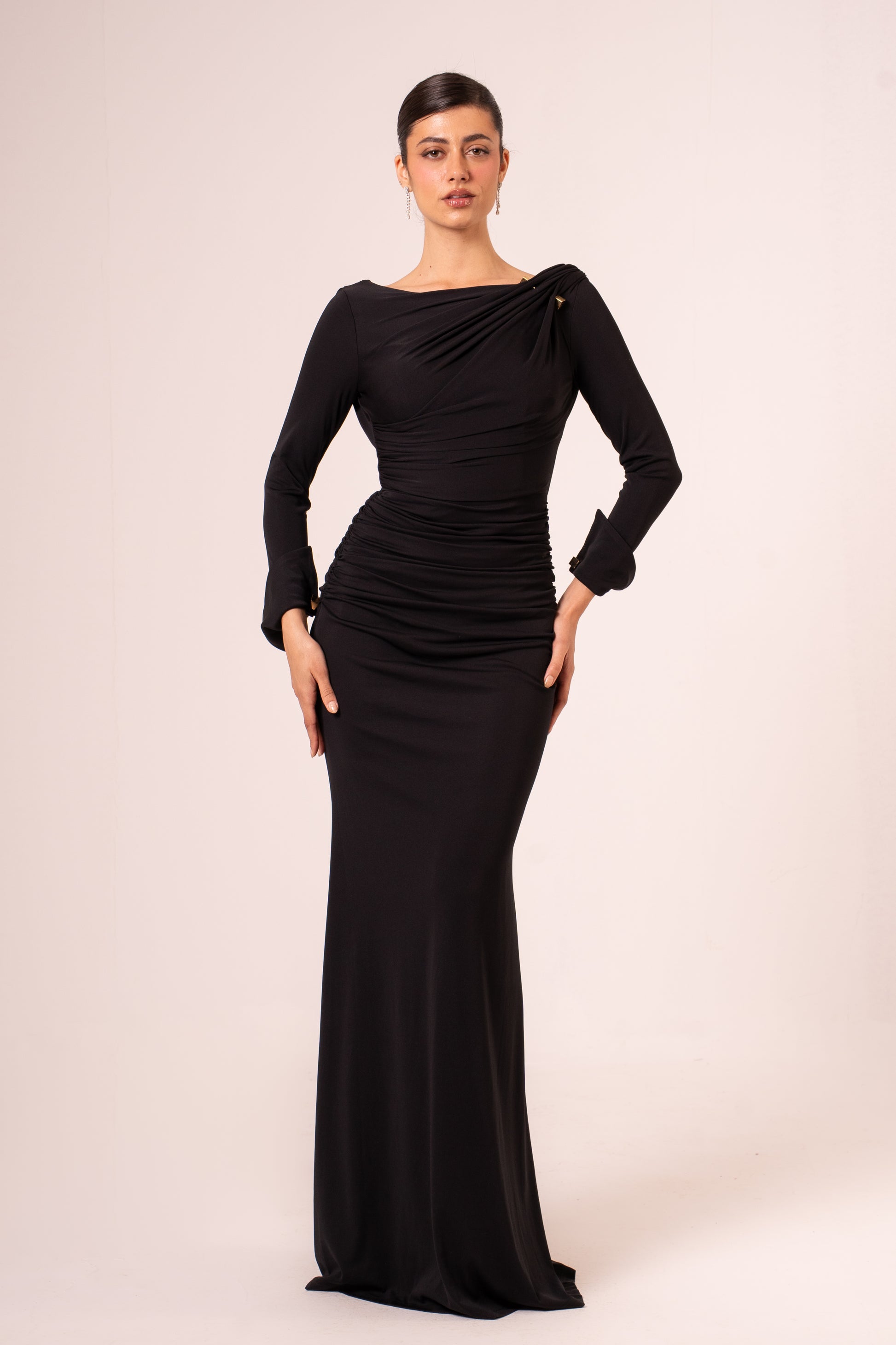 Razan is an elegant long-sleeved maxi evening dress designed for sophisticated occasions. The flowing silhouette drapes gracefully from shoulder to floor, offering timeless elegance and modest coverage. Long sleeves provide refined detail while the maxi length creates a striking, statuesque appearance. Perfect for formal events, weddings, and evening celebrations, this dress combines classic style with contemporary grace. The luxurious fabric moves beautifully with every step, ensuring comfort and confidence throughout the night.