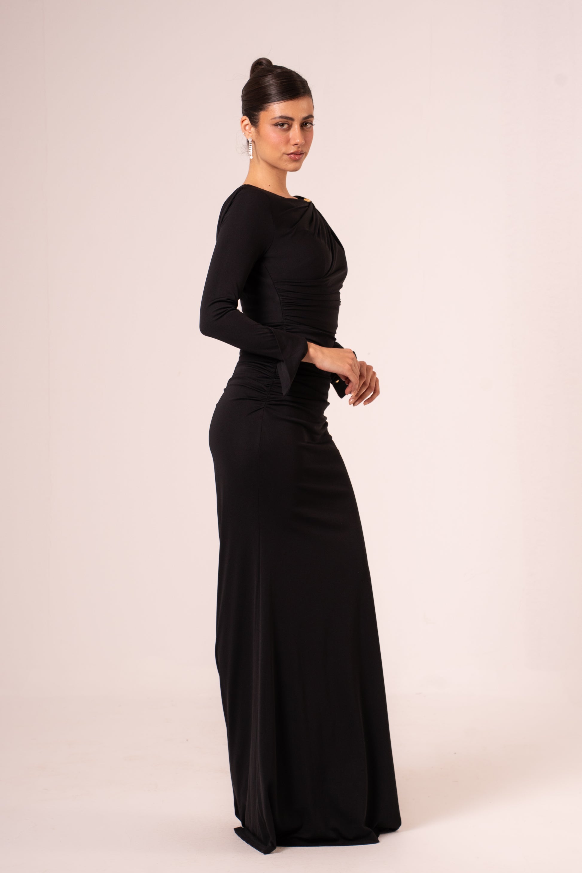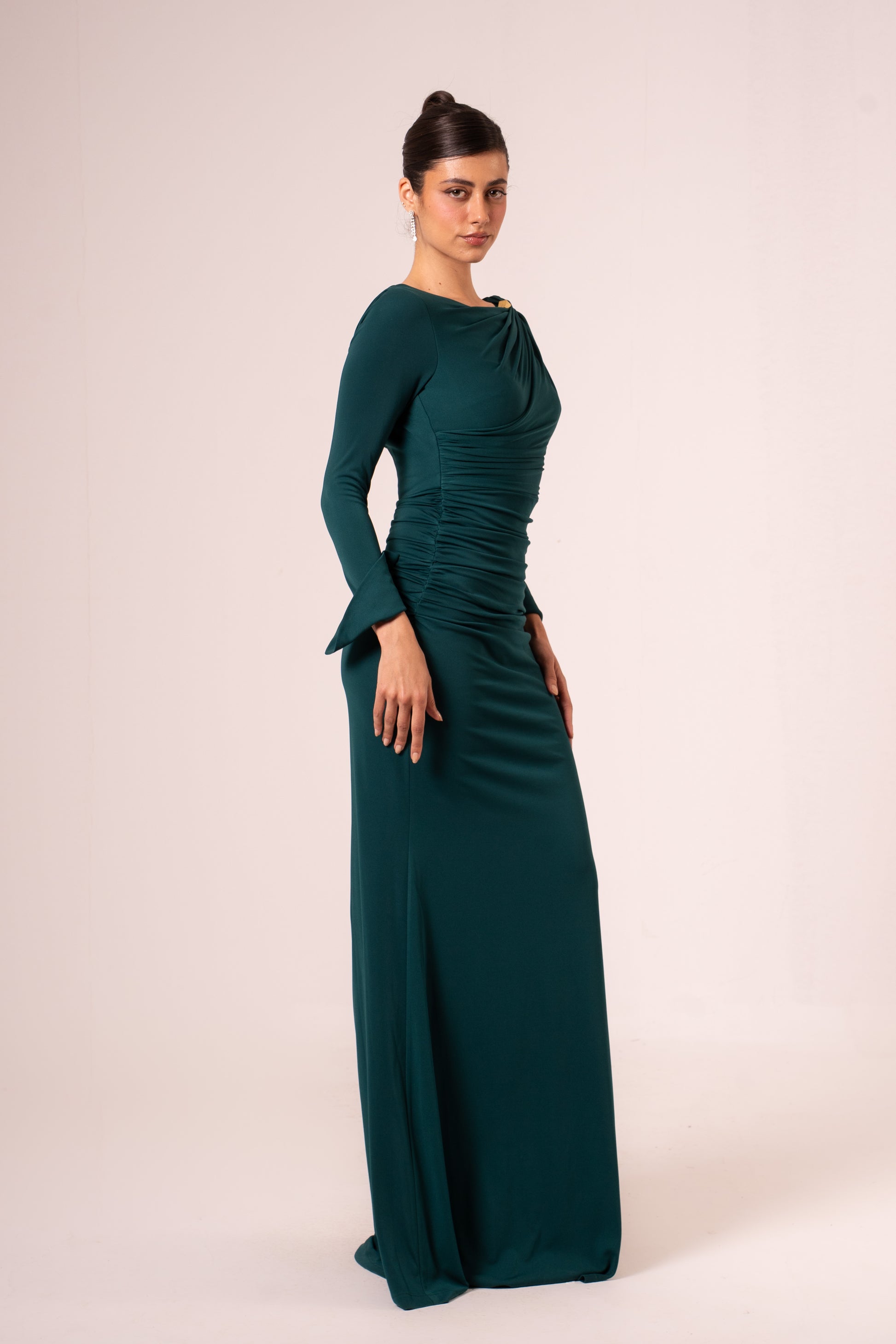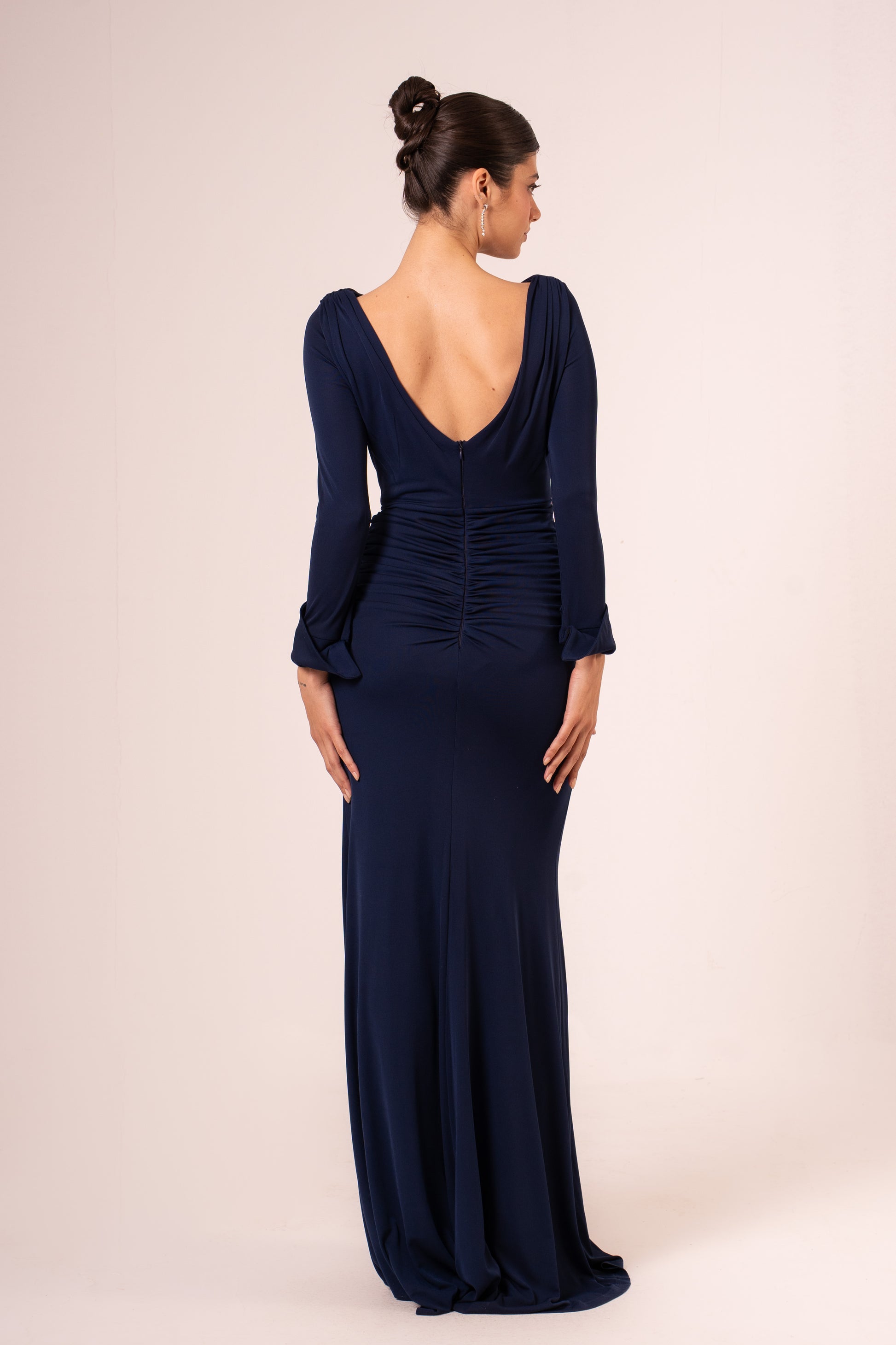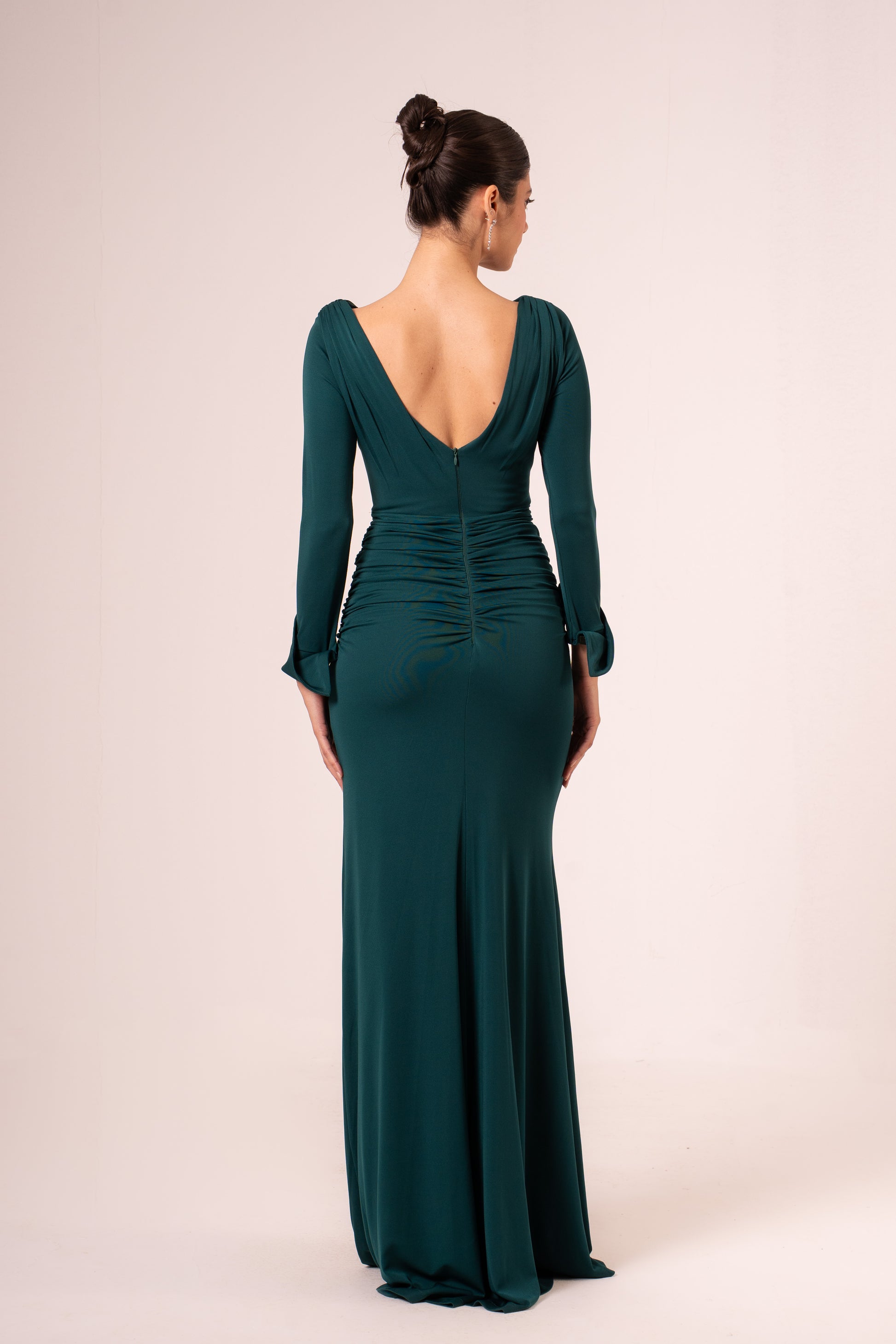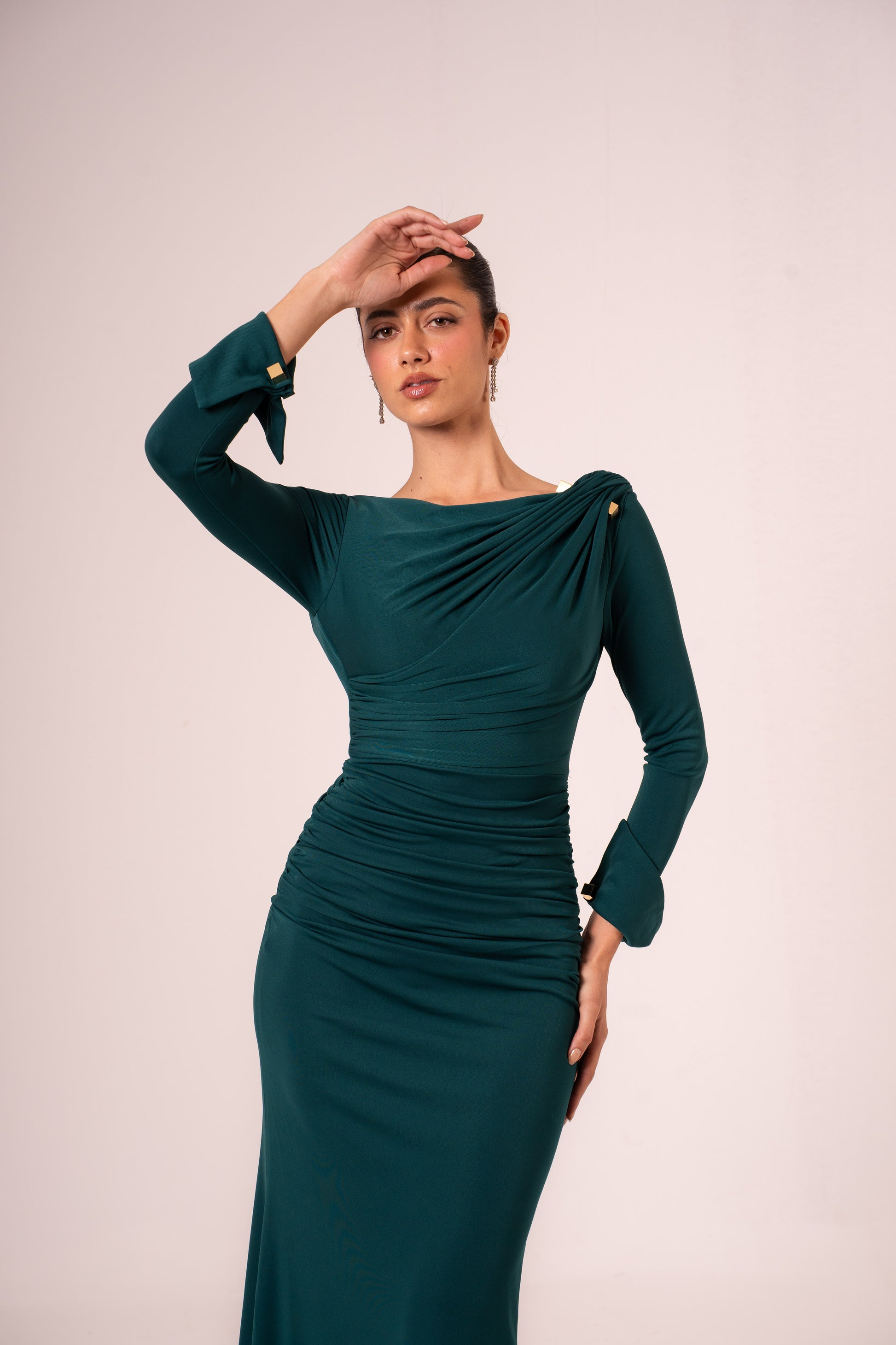 Razan is an elegant long-sleeved maxi evening dress designed for sophisticated occasions. The flowing silhouette drapes gracefully from shoulder to floor, offering timeless elegance and modest coverage. Long sleeves provide refined detail while the maxi length creates a striking, statuesque appearance. Perfect for formal events, weddings, and evening celebrations, this dress combines classic style with contemporary grace. The luxurious fabric moves beautifully with every step, ensuring comfort and confidence throughout the night.