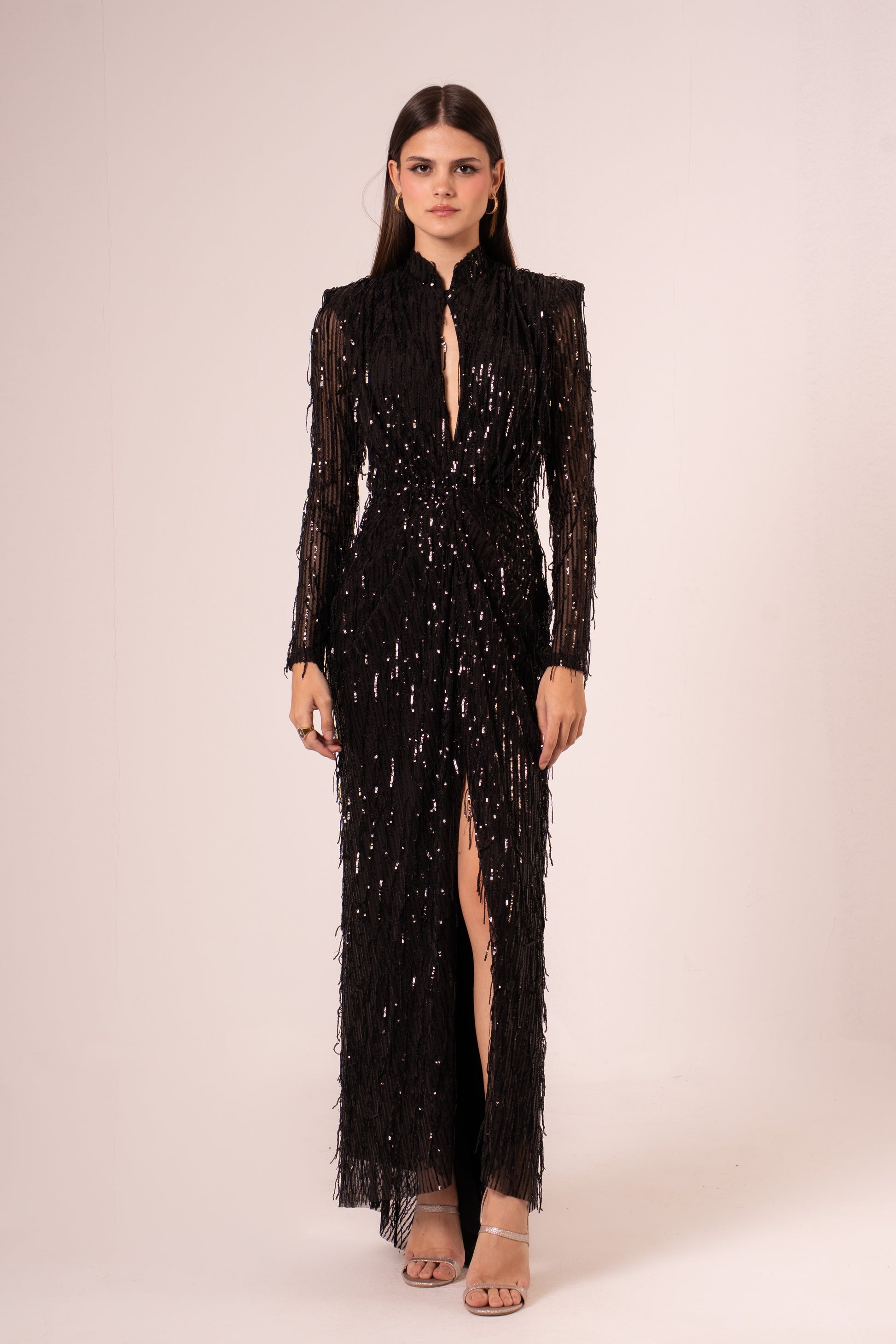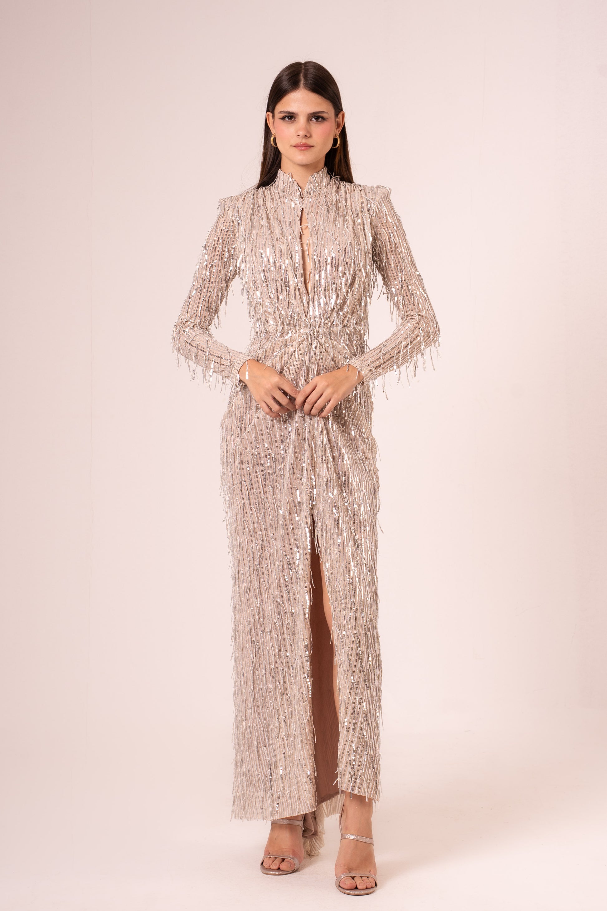 Elevate your evening elegance with the Reine, a stunning maxi dress that commands attention. Crafted with luxurious sequins that catch the light with every movement, this long-sleeved silhouette offers sophisticated coverage while maintaining an air of allure. The dramatic high slit adds a daring touch, allowing graceful movement and a hint of glamour as you walk. Perfect for galas, celebrations, and unforgettable nights out, this dress transforms you into the centerpiece of any room. The sequined fabric shimmers beautifully under evening lights, creating an enchanting effect that lasts all night long.